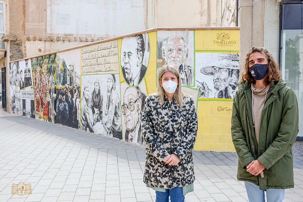 La alcaldesa de Tomelloso, Inmaculada Jiménez, ha felicitado al artista local Tomás Gutiérrez por el trabajo realizado en la plaza de España tras finalizar el gran mural que luce frente a la puerta principal de la parroquia de la Asunción. Se trata de una excelente composición que no deja indiferente a nadie sobre la que ha estado trabajando los últimos 9 días este joven tomellosero. Jiménez ha destacado el trabajo y talento de este creador que ha sabido recoger a la perfección en este trabajo de arte urbano lo más significativo de la historia local y de su amplio bagaje cultural.