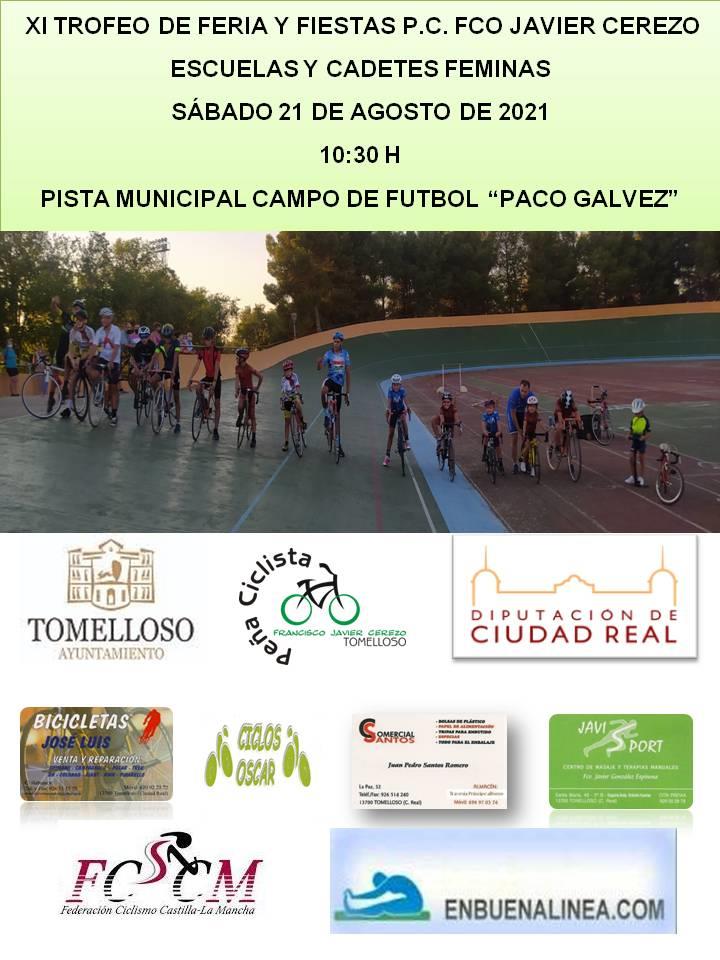 La Peña Ciclista Francisco Javier Cerezo organiza el XI Trofeo Feria y Fiestas que lleva su nombre el próximo sábado 21 de agosto en Tomelloso (Ciudad Real); prueba de escuelas que supone la undécima cita puntuable del Trofeo Federación de Castilla-La Mancha y la quinta carrera que el ciclismo base disputa en los últimos quince días dentro del apretado calendario del mes de agosto.