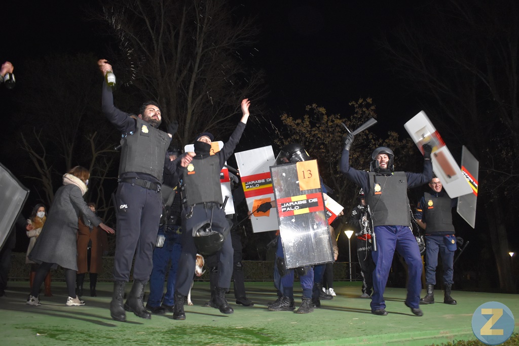Y ya en la modalidad de grupos, el quinto premio, dotado con 120 euros, ha sido para “Carnaval loco-buhos”; el cuarto de 150 euros se lo han adjudicado “Los payasos justicieros”¸el tercero de 200 euros ha sido para el número “Nos vamos pa la feria”, un grupo multigeneracional que ha causado sensación con su tablao flamenco; el segundo, de 250 euros, ha sido para el grupo que ha escenificado “Deliciosos y sin conservantes quesitos El Caserío” y finalmente los ganadores del primer premio de 280 euros han sido los bulliciosos policías de “Jarabe de palo” a los que no les ha faltado su furgón blindado y un perro. Como no podía ser de otra manera, han celebrado su premio a lo grande.