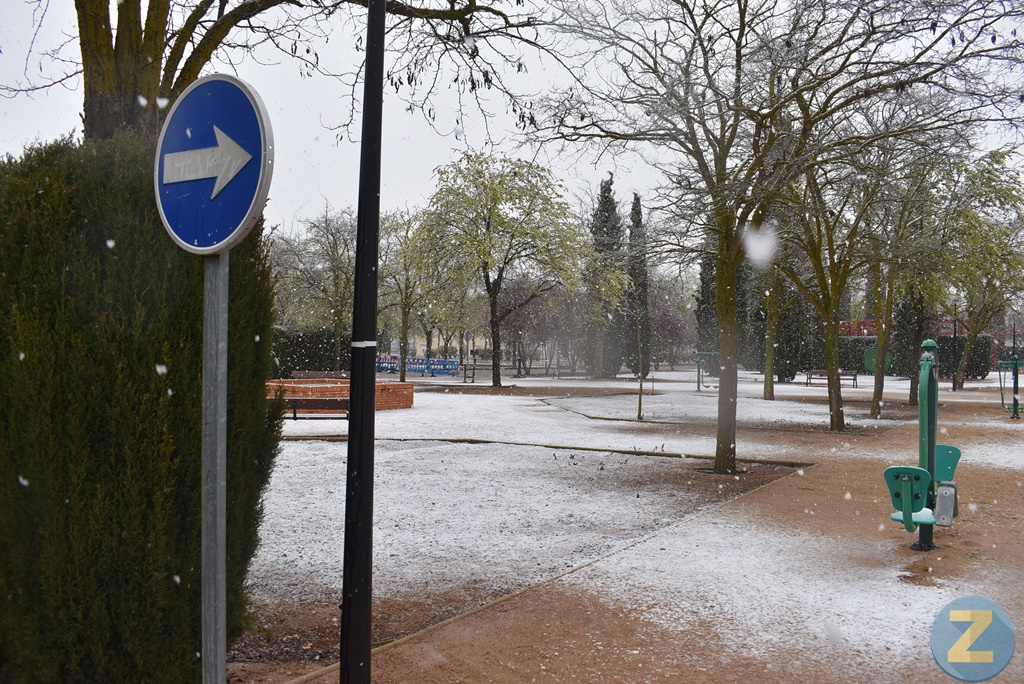 Después hemos podido tomar fotografías de zonas más periféricas de Tomelloso, cuando la nevada ha ido arreciando y se han empezado a ver zonas blancas, tanto en el casco urbano como en zonas rurales. La nieve se ha acumulado también en zonas ajardinadas, carrocerías de los coches y los tejados.