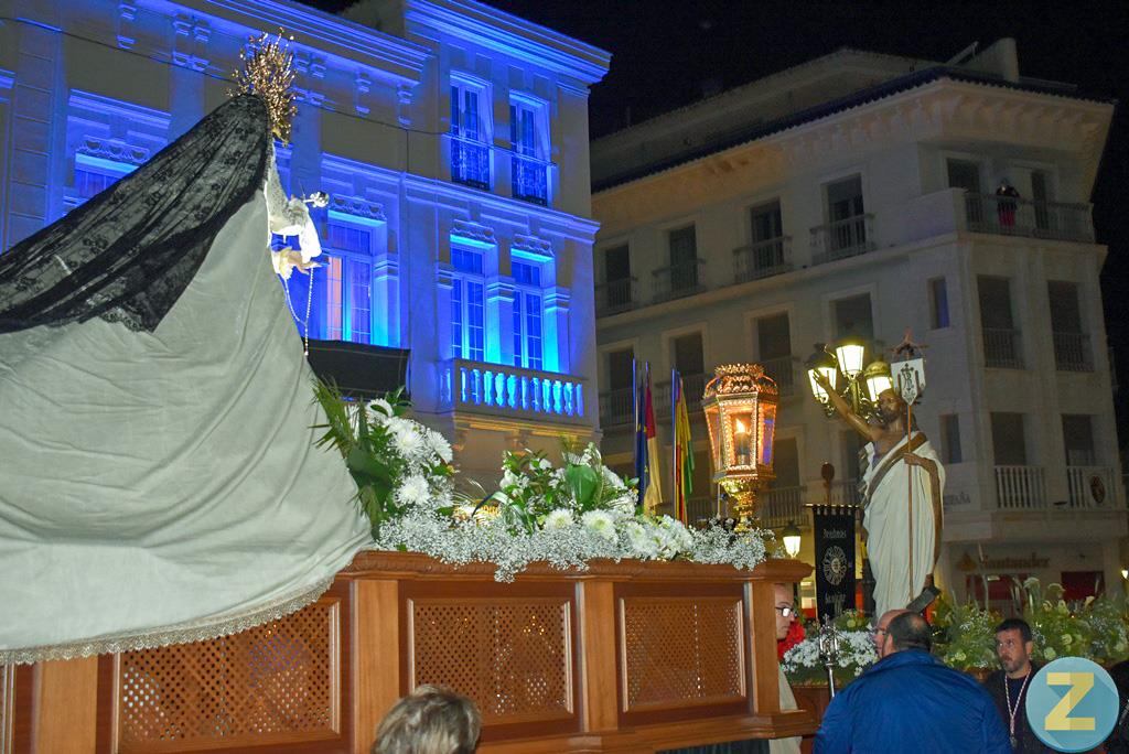 Han acompañado a la Virgen, tres hermandades y al Cristo Resucitado, ocho. Todos los estandartes se han colocado en paralelo a la fachada principal del Ayuntamiento. El párroco de la Asunción de Nuestra Señora, José Ángel Martín, ha pronunciado el Pregón Pascual manifestando que “les tengo que comunicar a todos una gran noticia en esta noche gozosa, la vida vence a la muerte con el Cristo Resucitado”. En el Pregón ha aludido a los dos duros años de pandemia y se ha recordado a los que ya no están. También se han hecho votos para que cesen los conflictos bélicos que en estos momentos hay en el mundo. La fachada del consistorio ha vuelto a lucir los colores azul y amarillo de la bandera ucraniana.