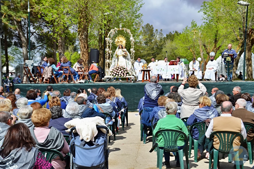Miles de fieles han sido con devoción la Eucaristía en la que ha cantado el Coro de Santo Tomás de Villanueva y han  leído varios miembros de la Hermandad, rogando por los que ya no están con nosotros. Entre el público se ha visto a representantes y cargos de otras hermandades vecinas como La Solana, Campo de Criptana, Argamasilla de Alba o Pedro Muñoz. Como ya es tradición, al finalizar, muchos niños han recibido la medalla de la Virgen.