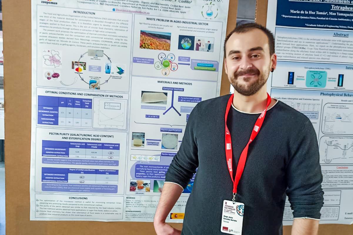 Cátedra de Economía Circular. Fue en este punto en el que el tomellosero Diego Jesús González Serrano fue galardonado con uno de los dos premios a mejor póster en la rama de Ciencias. El póster, titulado “Química Circular Alimentaria: Extracción y Optimización de Polisacáridos Pécticos procedentes de Residuos Aliáceos”, versa sobre la obtención de productos sostenibles de aplicación en diversos sectores a partir de residuos de la industria del ajo en Castilla-La Mancha. El trabajo fue realizado además en colaboración con la empresa manchega COOPAMAN S.C.L., ubicada en las Pedroñeras (Cuenca) y ampliamente conocida por la producción, manipulación y comercialización de ajos de gran calidad como los pertenecientes a la Indicación Geográfica Protegida “Morado de Cuenca”.