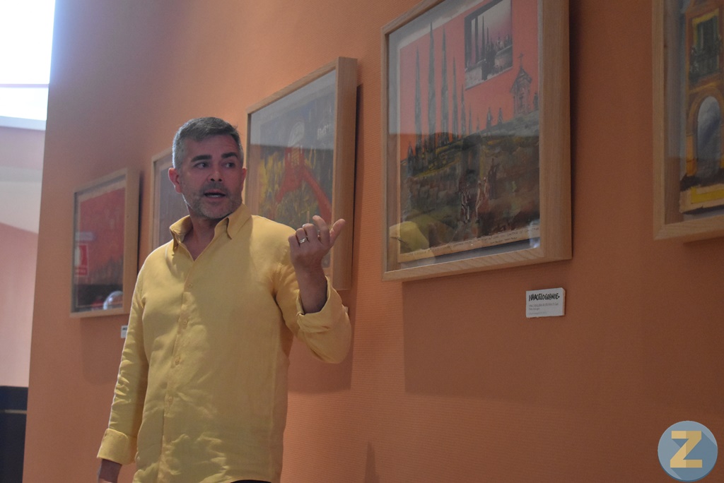 La visita se ha iniciado en el vestíbulo de entrada del teatro, teniendo como referencia uno de los cuadros del artista en los que se observa su gran dominio del color y la mezcla de técnicas que solía llevar a cabo para terminar sus obras. Carrión ha ido desgranando la vida artística de un hombre que realizó una gran aportación a la pintura y al teatro en su condición de escenografo. Ha recordado que fue nominado a un premio Goya por unos de sus magníficos trabajos. Carrión ha explicado en qué consiste el trabajo del escenografo que es el que dispone los elementos que van dentro del espacio escénico, pero que interviene también en la iluminación, vestuario e incluso del maquillaje de los actores.
