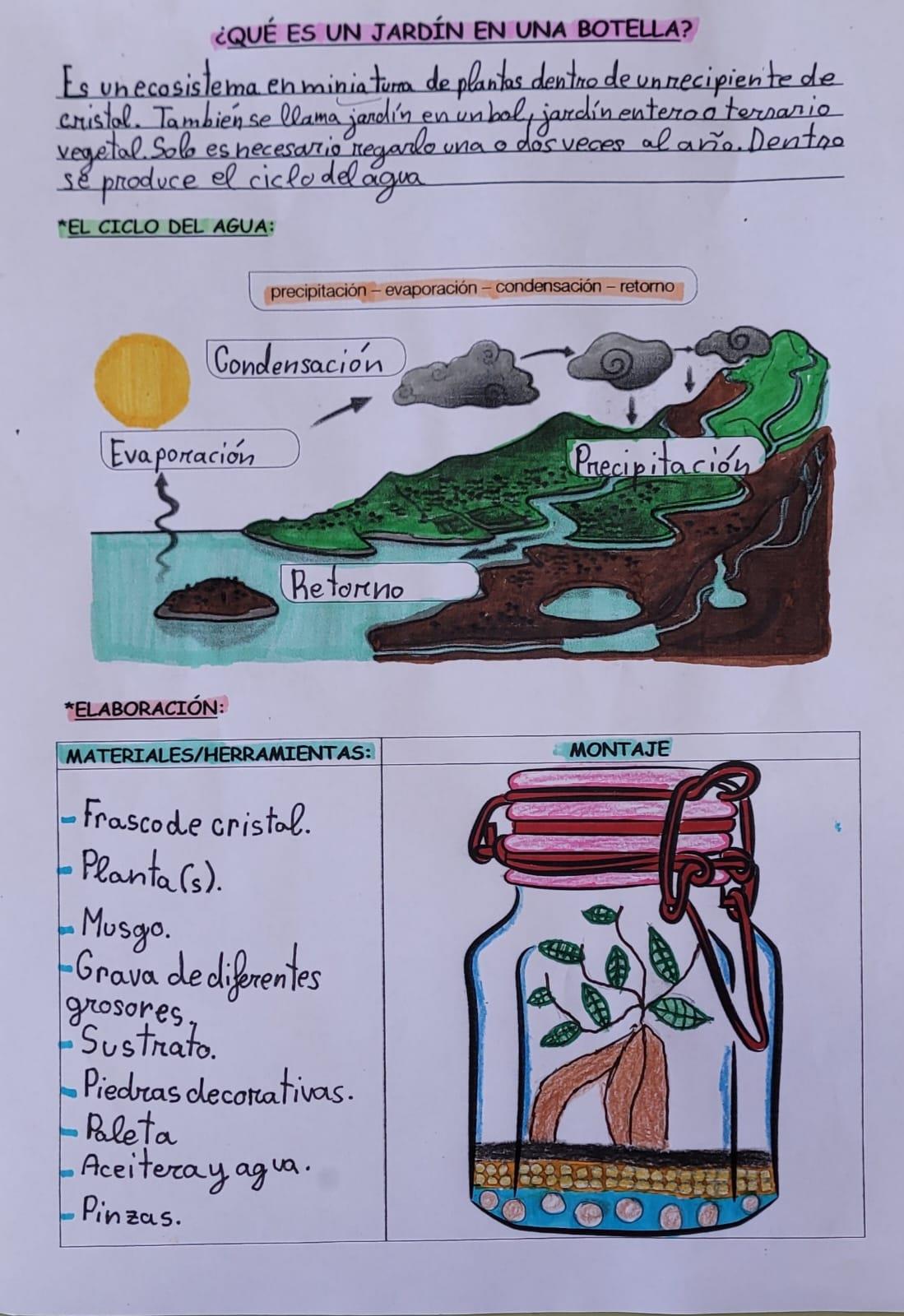 Con la citada actividad se han elaborado unos ecosistemas vegetales en miniatura dentro de unos frascos de cristal. Contienen gravas de distintos grosores, sustrato vegetal y una planta. Además, se han introducido algunos elementos decorativos como piedras de colores y conchas. Dentro de cada terrario se produce a pequeña escala el ciclo del agua al igual que ocurre en la naturaleza. Por ello, sólo es necesario regarlos unas pocas veces al año.