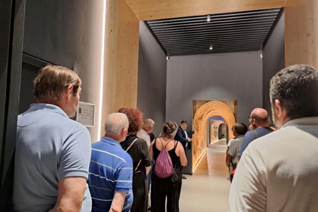Los dieciocho integrantes del grupo, después de degustar una comida tradicional manchega, visitaron las instalaciones de la cooperativa Virgen de las Viñas Bodega y Almazara, acompañados por el concejal de Agricultura, Jesús Lara y el presidente de las Rutas del Vino de La Mancha, Raúl Zatón. Una visita guiada, que incluyó el lagar y las cuevas de la entidad, que encierran parte de la historia vitivinícola de la ciudad. Después visitaron también una cueva tradicional que aún conserva las tinajas en las que se elaboraba el vino y que son símbolo del origen de Tomelloso.