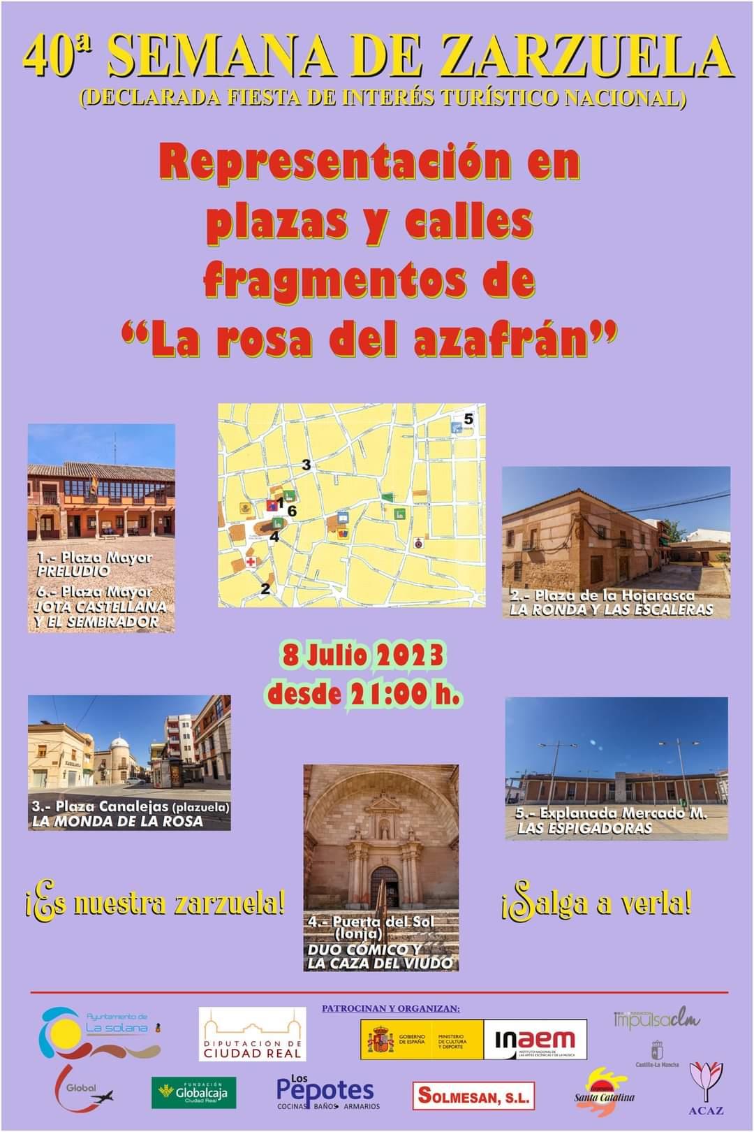 La Asociación Cultural Amigos de la Zarzuela –ACAZ- de La  Solana (Ciudad Real) y el Ayuntamiento de La Solana organizan el próximo 8 de julio, desde las 21 horas, una representación en plazas y calles de fragmentos de “La rosa del azafrán”, como antesala a los actos previstos en esta localidad para la celebración de la 40ª Semana de la Zarzuela, Fiesta de Interés Turístico Nacional, que tendrá lugar el próximo otoño.
