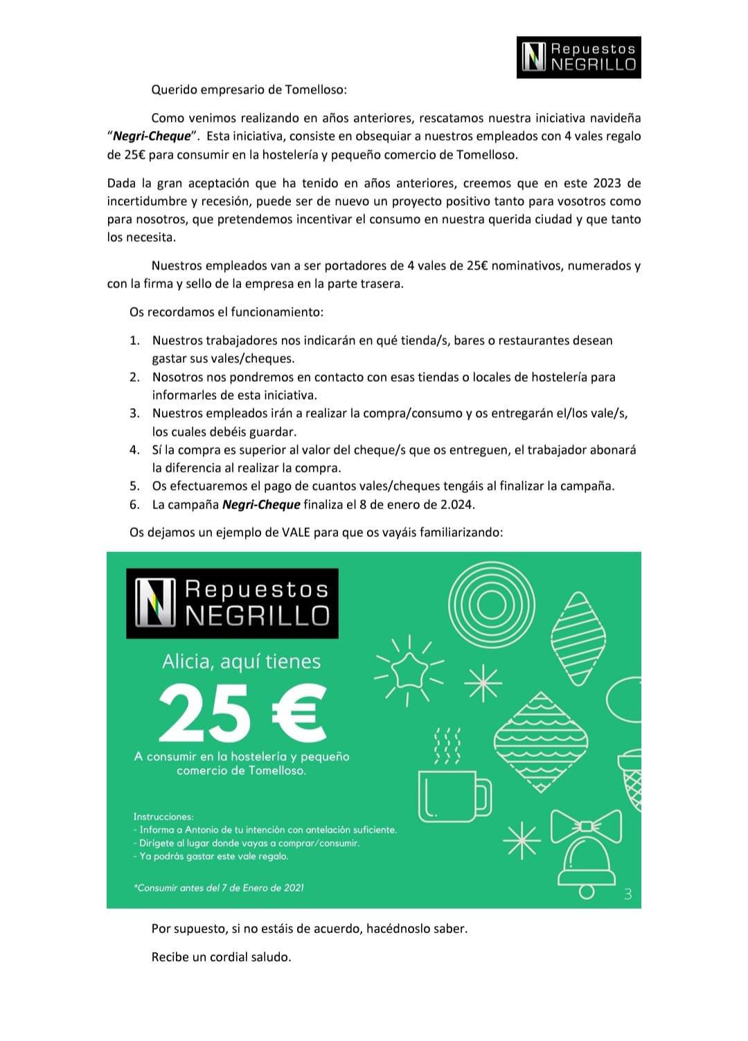 Repuesto Negrillo ha vuelto a poner en marcha su campaña navideña “Negricheque”. La iniciativa consiste en obsequiar a sus empleados con cuatro vales regalo de 25 euros para consumir en la hostelería y el pequeño comercio de Tomelloso. Los responsables de la empresa explican que “dada la gran aceptación que tuvo en años anteriores, pensamos que en este 2023 de incertidumbre y recesión, puede ser positivo para incentivar el consumo en nuestra querida ciudad y que tanto lo necesita”.