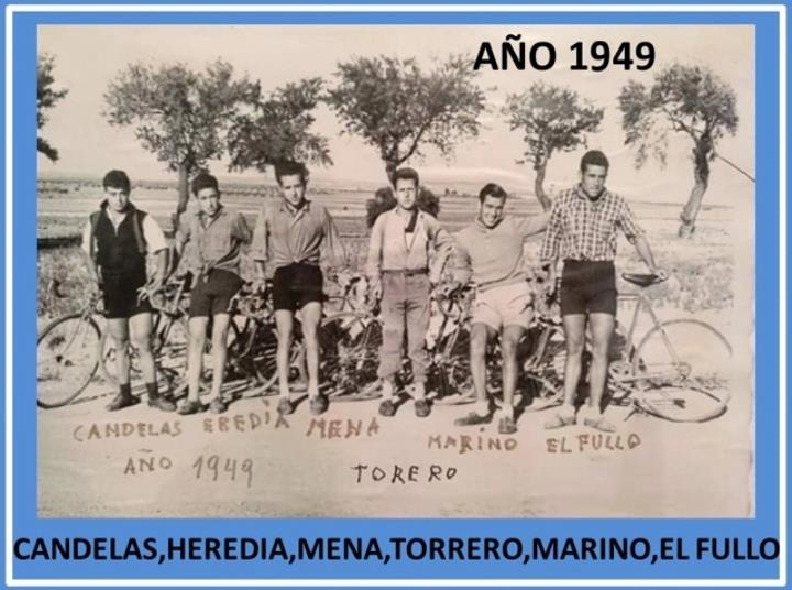Entrañable y de mucho valor histórico para los amantes del ciclismo la foto que le mostramos hoy. Una foto del año 1949 en la que aparecen recordados ciclistas de nuestra ciudad como Candelas, Heredia, Mena, Marino, Torrero y El Fullo. Posan sonrientes después de hacer un alto en uno de sus entrenamientos y con ellos rememoramos los episodios de aquel ciclismo tomellosero que tan bellas páginas escribio. Ciclista de casta y clase que, en muchas ocasiones, le complicaban la vida a los grandes ciclistas profesionales que con frecuencia se acercaban a competir por estas tierras.