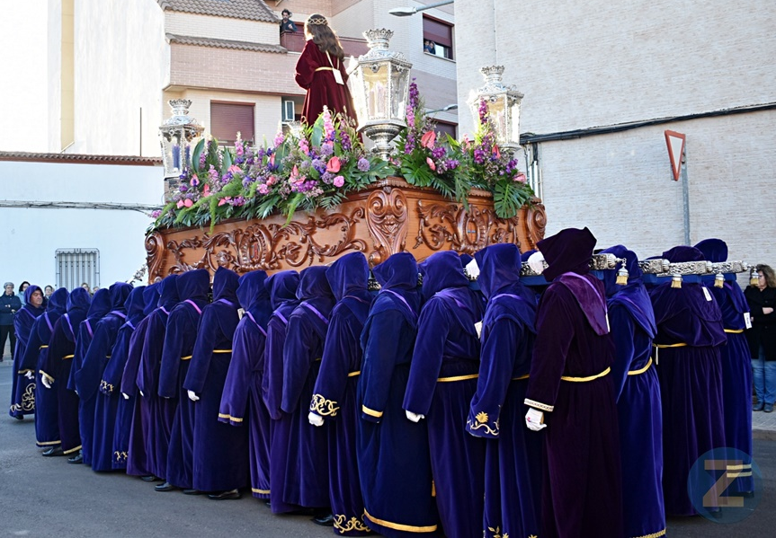 El paso ya esperaba en el pretil del la plaza esperando a los penitentes. El Nazareno mostraba corona de espinas, hábito morado con bordados de oro y manos entrecruzadas y atadas por una gruesa cuerda que cae junto al hábito. Una mirada caída, un rostro de sufrimiento, así es como es presentado por Pilatos al pueblo, muestra cara de vencido, una imagen humana, de sumisión. La imagen se eleva fastuosa sobre el paso acompañado de varios centenares de nazarenos que lo custodian a lo largo de la procesión. José ocupa uno de los último lugares, su altura y corpulencia hacen de él un buen referente para frenar a los feligreses que acompañan al paso. Colocado en el lateral derecho observa desde allí el lento andar de la procesión y le permite en cada parada reflexionar sobre las curiosidades de la vida, observar a los espectadores con esas caras mustias y de respeto hacia el paso. La procesión requería requiere momentos de recogimiento, de vivir con “PASIÓN” las primeras horas tras la muerte de Cristo.