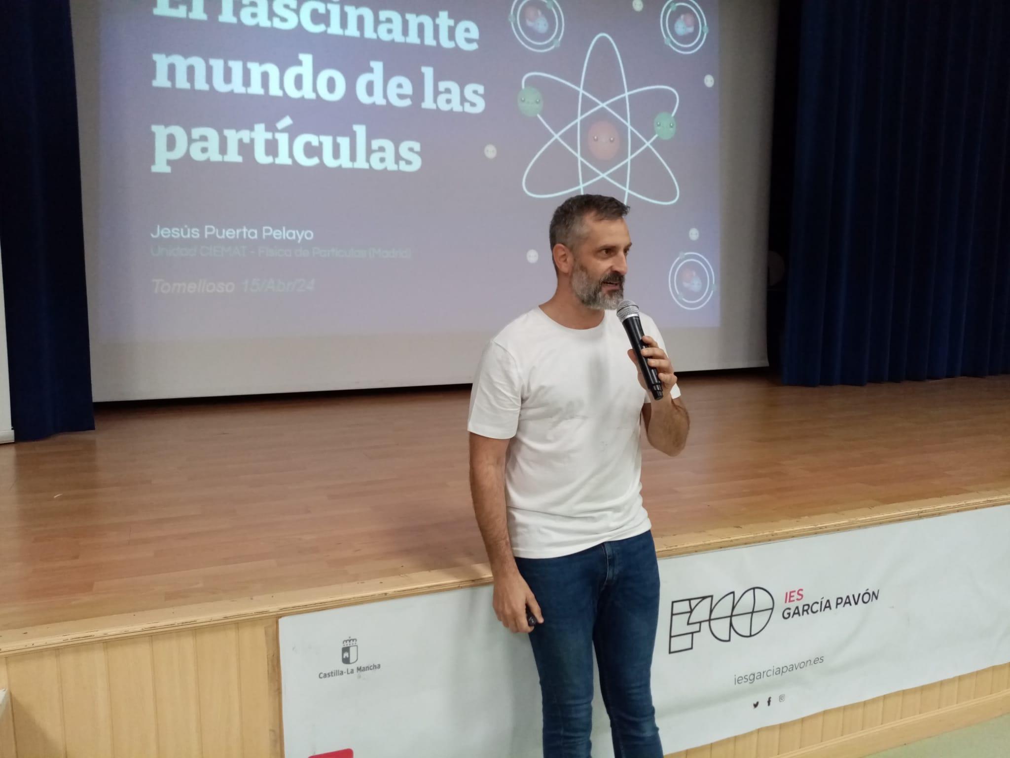 Jesús Puerta Pelayo ha acercado este lunes el fascinante mundo de las partículas a los alumnos del Instituto García Pavón de Tomelloso. Doctor en Ciencias Físicas por la Universidad Autónoma de Madrid e investigador en la Unidad CIEMAT - Física de Partículas (CFP)-, Puerta es miembro desde el año 2000 de la colaboración experimental CMS (Compact Muon Solenoid) del Gran Colisionador de Hadrones (LHC) en el CERN que se ubica en Ginebra. En paralelo a su actividad científica, cuenta con una larga carrera como divulgador científico, tanto en primera persona como coordinando grupos y proyectos de cultura científica