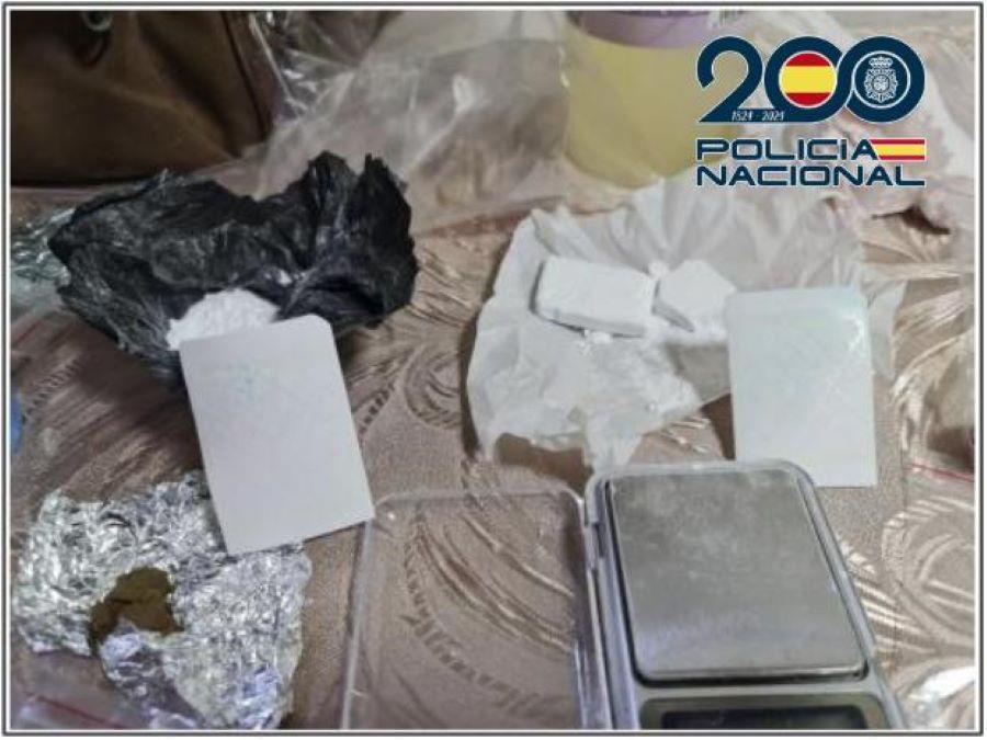 Los investigadores decomisaron una mochila oculta en el fondo de una papelera que contenía 31 gramos de cocaína, 23 gramos de hachís y 4 gramos de marihuana, ya envasados y distribuidos para su venta, además de útiles y sustancias químicas para el corte y procesamiento de la cocaína, junto a una báscula de precisión.