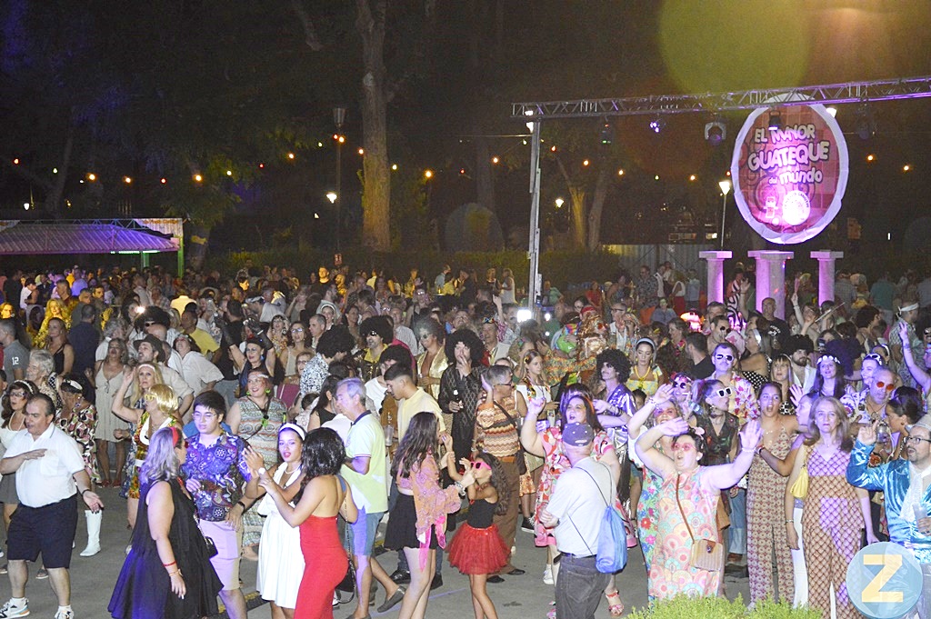 La fiesta, organizada por Ayuntamiento y la peña Los Canuthi, ha alcanzado su cenit pasada la media noche con buena parte de los asistentes ataviados con trajes de la época de alegres estampados, cuellos de pico largo, pantalones de campana, cabellos recogidos con diademas o prendas con vistosas lentejuelas. Algunos se han caracterizado en clave de humor, apareciendo personajes como el pintor Antonio López Torres, Fredy Mercury, Demis Roussos o un tronchante equipo de sanitarios, que han ido creando una estampa de alegría, colorido y ritmo que ha revivido aquellos inolvidable guateques de hace más de medio siglo.