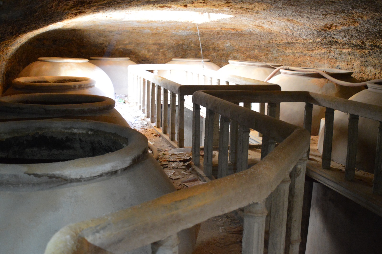 El puente y el balaustre pertenecen también intactos en una cueva que alberga trece tinajas de cemento y dos de barro. Un hueco delata que hubo alguna tinaja de barro más de unas trescientas arrobas de capacidad con base muy estrecha. Las de cemento son de distinto tamaño, las haya de 500 y 400 arrobas. Unos rabos estriados pintados en blanco van separando las tinajas. Por arriba están unidas por un empotrado pintado en sanguina y rematado por ese balaustre que parece hecho ayer mismo.