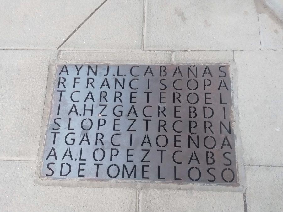 Muy atinadamente la anterior Corporación Municipal, en su afán de llevar el arte y la cultura a la calle cambio las lumbreras de las cuevas de la calle Independencia, las viejas de láminas verticales enrejadas a la acera, por unas láminas de acero que conforman una sopa de letras en la que aparecen inscritos los apellidos de personas insignes de Tomelloso. Los García, Martínez, Cabañero, López, Torres, Grande, Quirós, Cañas, Carretero, Cabañas,… Sus horadados apellidos dejan pasar la luz a la cueva del saber. Allí posan como barricas incunables las historias de Plinio, Marisa Sabia, Horacio Martín, los Palancas, el paisaje Manchego, la Abuela Juana, Carmencita jugando, la plática del pintor especialista en trinos y el pintor alcalde. Mientras “El Varal” asoma sus ojos a la luz y narra a los allí presentes los “eventos consuetudinarios que acontecen en la rua”.