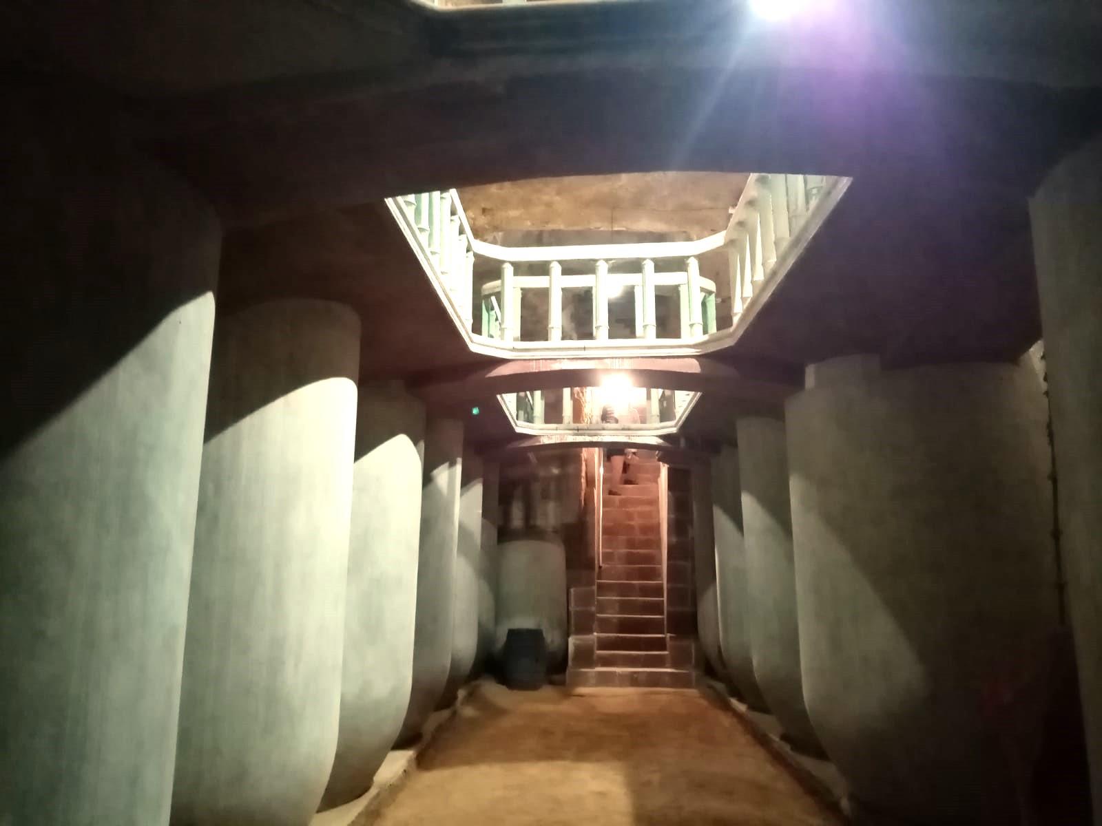 Accedemos por una escalera revestida con baldosas rústicas y un agradecido pasamanos que hace más segura nuestra bajada. El techo de la escalera describe un arco de medio punto, mientras que las paredes están reforzadas. La cueva mayor contiene 16 tinajas de cemento de 500 arrobas de capacidad, además de una más pequeña que era la del vinagre. Llaman la atención el balaustre y tres puentes que cruzan la cueva de lado a lado. Están impecables, pintados en blanco y verde, mientras que el empotrado, decorado con una bonita moldura, presenta una tonalidad burdeos.