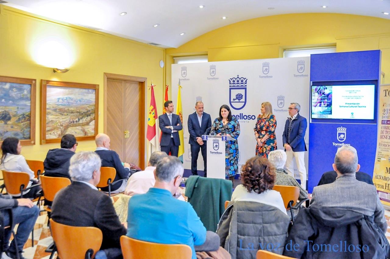 Marzo será un mes con marcado acento taurino en Tomelloso con la celebración de la Semana Cultural Taurina, que arrancará el 18 de marzo, y la XXII Corrida Benéfica que tendrá lugar el 23 de marzo y será retransmitida por la cadena autonómica de televisión. Ambos acontecimientos se han presentado este viernes en el Ayuntamiento de Tomelloso con presencia de las concejalas del equipo de gobierno, Inés Losa y Eloísa Perales; el presidente de la Peña Taurina de Tomelloso, Luis Antonio Perales; el responsable de Producciones Taurinas La Mancha S.L.,Ángel Luis Ortiz ,y el representante de las escuelas taurinas de la provincia, Diego Ortega.