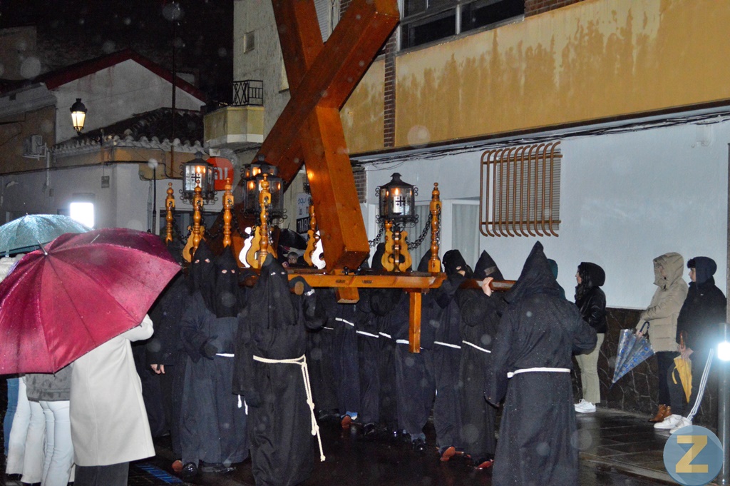 Más de doscientos cincuenta nazarenos de la Cofradía de la Penitencia de la Santa Cruz, con la cruz al hombro y ataviados con túnica negra y capucha monacal, han participado en la procesión desafiando la lluviosa madrugada, elemento adverso que, en muchos casos, se ha añadido al hecho de ir descalzo sobre el asfalto mojado, portar la Cruz o tirar de gruesas cadenas. Muchos de esos nazarenos forman parte de otras hermandades y algunos de ellos habían participado horas antes en la Procesión del Entierro de Cristo, lo que da una idea del enorme esfuerzo realizado.
