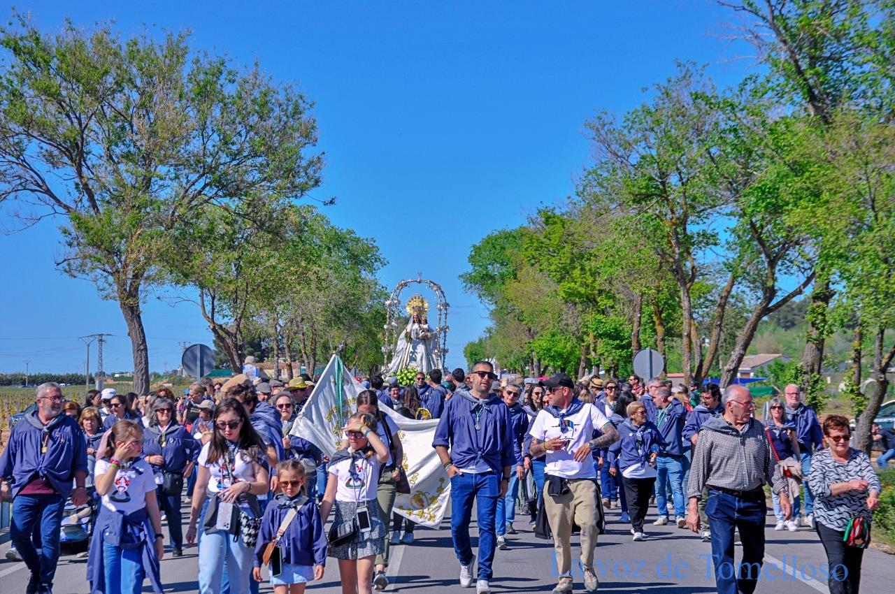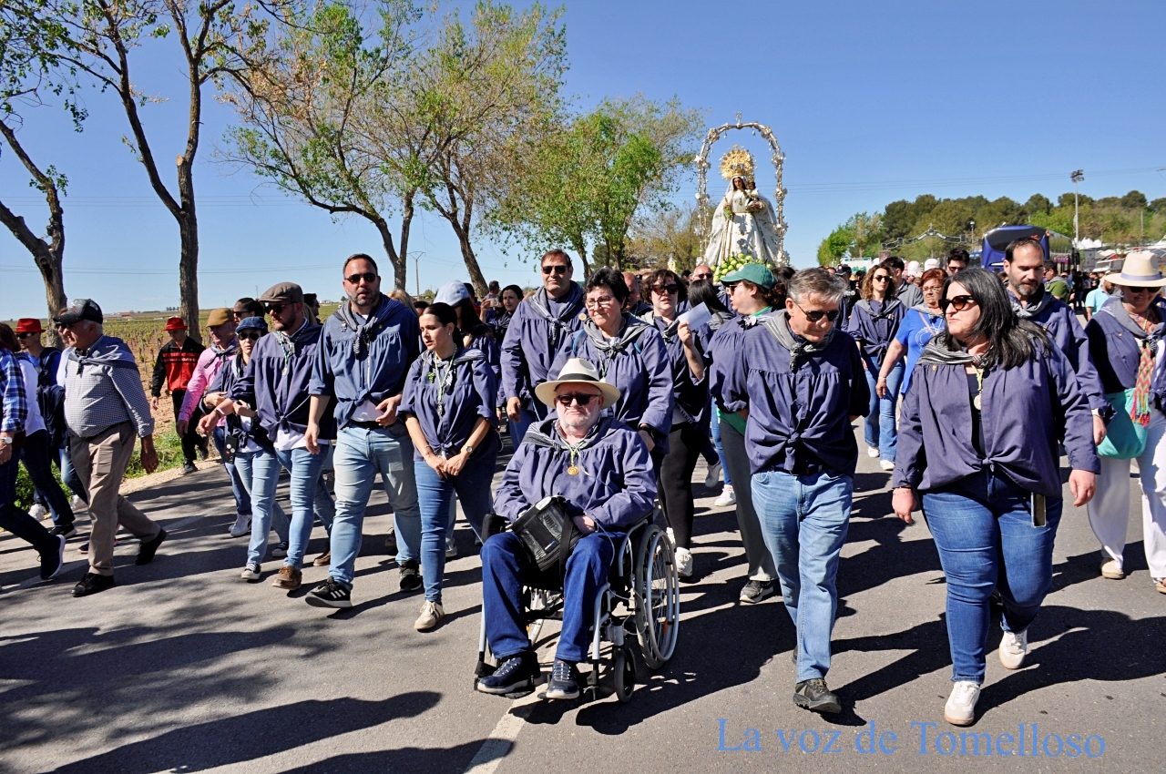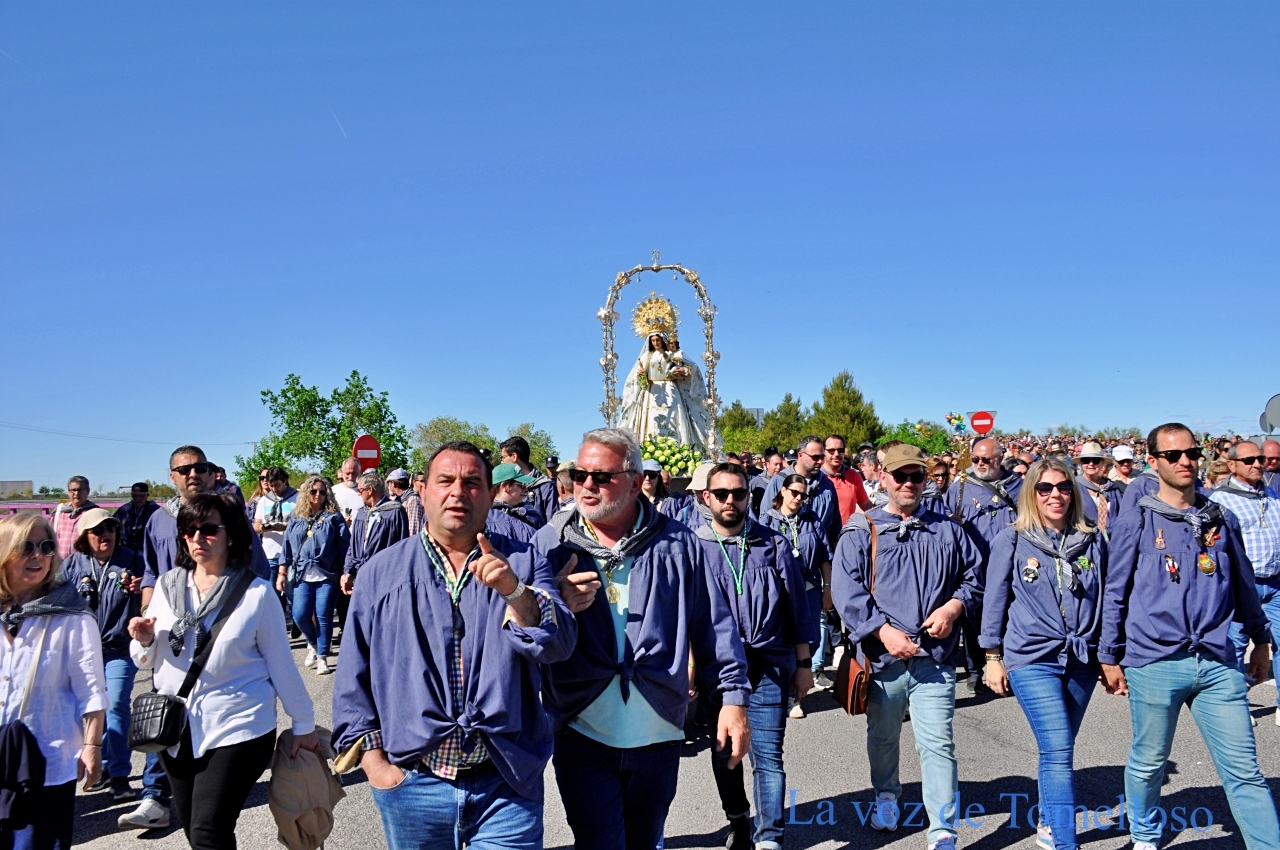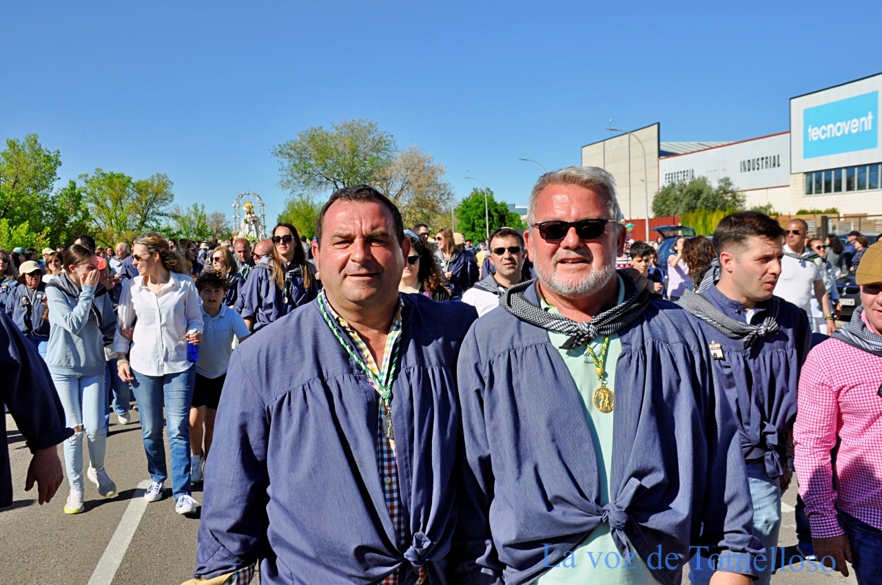 Abrían el cortejo las servidoras de la Virgen y el mayordomo, tras ellos, un río interminable de público acompañaba a la imagen, más numeroso incluso que en años anteriores, desbordando el camino de fervor y de esperanza. El presidente de la Hermandad, Alejandro Ramírez; la pregonera, Elena Jiménez; el mayoral, Javier Perales; y el alcalde de Tomelloso caminaban delante de la Virgen de las Viñas. Acompañaban a la Patrona concejales de todos los grupos municipales y miembros de la Junta Directiva de la Hermandad.