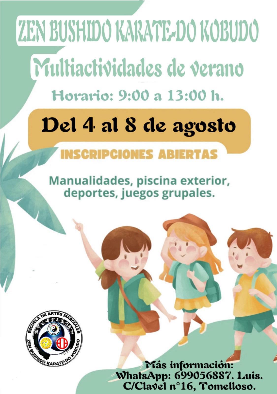 La Escuela de Artes Marciales Zen Bushido Karate Do Kobudo de Tomelloso ha presentado un programa de multiactividades que se desarrollará del 4 al 8 de agosto.  Será una semana de diversión, aprendizaje y cultura a traves de entrenamientos de karate, kobudo y defensa personal civil; piscina; juegos grupales, manualidades deportes, rutas guiadas para conocer las costumbres y cultura Tomellosera y juegos acuáticos al aire libre.
