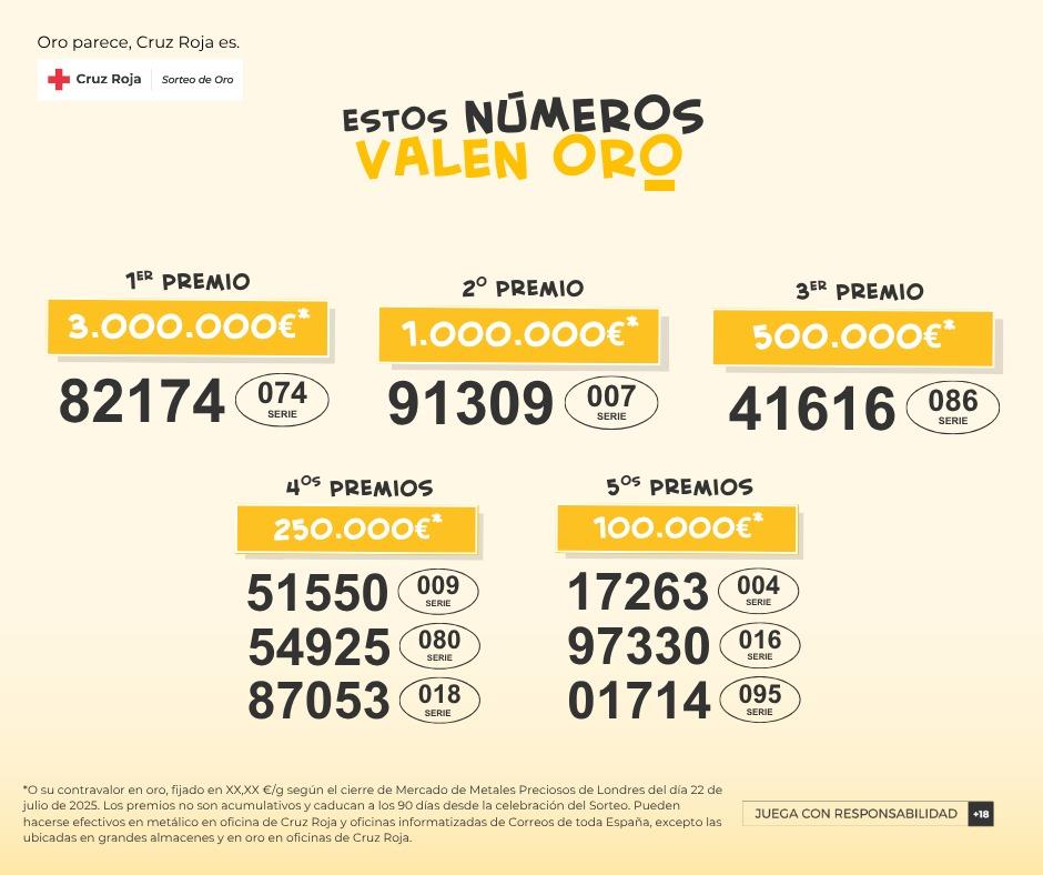 (*) O su contravalor en oro fijado según el cierre del Mercado de Metales Preciosos de Londres del día 22 de julio de 2025 (93,69 € / gramo). Los premios no son acumulativos y caducan a los 90 días desde la celebración del Sorteo. Pueden hacerse efectivos en metálico en oficinas de Cruz Roja y oficinas informatizadas de Correos de toda España, excepto las ubicadas en grandes almacenes y en oro en oficinas de Cruz Roja. Normativa del Sorteo, protección de datos o cualquier otra información en www.cruzroja.es/sorteodeoro.