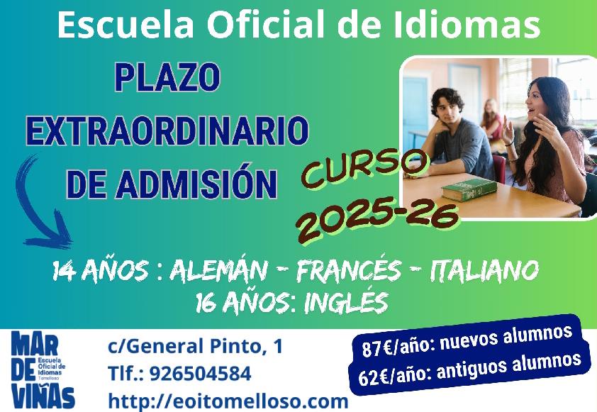 La Escuela Oficial de Idiomas (EOI) Mar de Viñas de Tomelloso ha abierto el plazo extraordinario de admisión para el curso 2025-2026. Los estudiantes podrán presentar su solicitud entre el 1 y el 12 de septiembre a través de la plataforma EducamosCLM – Secretaría Virtual, donde también se formalizará el pago de la matrícula.