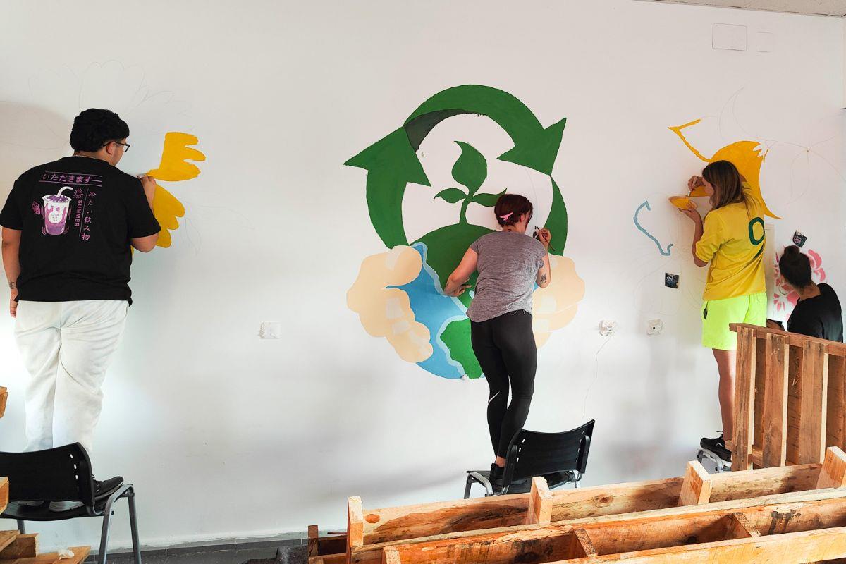 En la pared principal destaca un mural colorido con dos manos que sostienen el planeta del que brota una planta, acompañado de la frase: “Nadie puede hacerlo todo, pero todos podemos hacer algo”. Una obra reivindicativa que resume el espíritu del proyecto.
