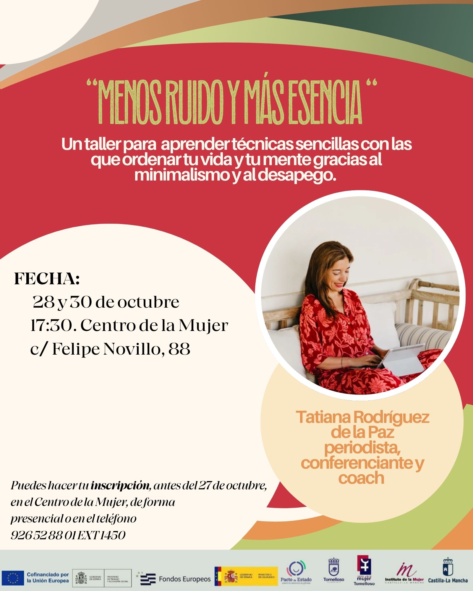 El Centro de la Mujer de Tomelloso ha programado para los días 28 y 30 de octubre el taller “Menos ruido y más esencia”, un taller para aprender técnicas sencillas con las que ordenar la vida y la mente gracias al minimalismo y al desapego.