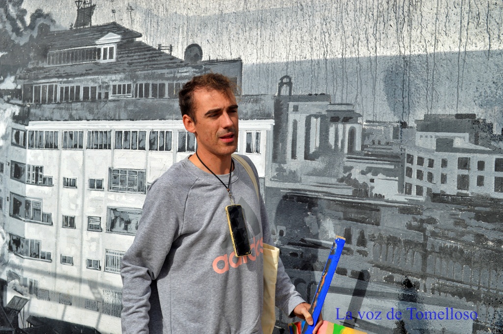 El mural de Bigastro, de Alicante, está confeccionado con brocha redonda y se distingue por unas curiosas veladuras; en otro aparece una mujer conduciendo y hablando con el móvil, elemento que se representa con un color fusia que atrae la atención del espectador y finalmente llegamos a la calle García Pavón para ver el último mural que rinde homenaje al sector del metal. Bonita composición en la que sobre un fondo de grises, blancos y negros aparece un cuadro de color. Un mural que el artista elaboró en día y medio “viéndolo trabajar parecía una impresora robotizada. Impresionante”, concluye diciendo Tomás que ya nos ha ido indicando las paredes e inmuebles que también tendrán murales en el futuro y que seguirán llenando de buen arte el barrio.