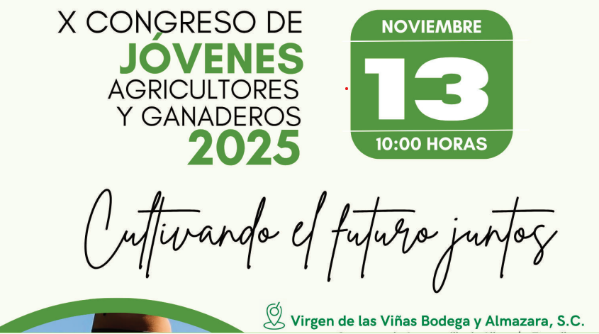 Tomelloso es la sede elegida para la celebración del X Congreso de Jóvenes Agricultores y Ganaderos de la Asociación Agraria-Jóvenes Agricultores (ASAJA) de Ciudad Real. El encuentro tendrá lugar el próximo 13 de noviembre en Virgen de las Viñas Bodega y Almazara, S.C. Se trata de una cita ya consolidada en el calendario de la organización agraria provincial, que reúne a centenares de jóvenes del sector para analizar los retos de futuro, la innovación y las oportunidades de emprendimiento en el medio rural.