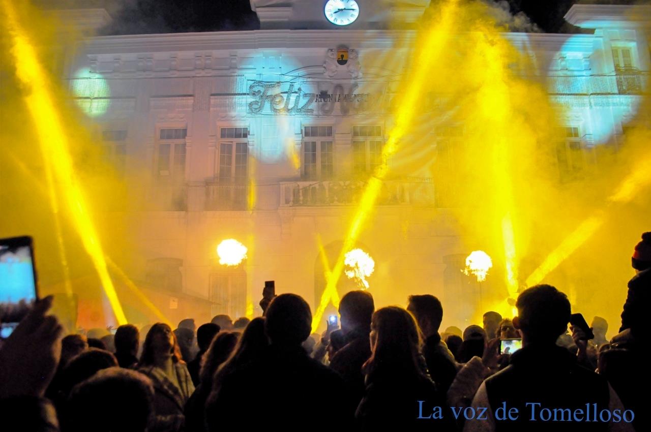 Llamaradas, una espectacular pirotecnica y bengalas se iban sucediendo a gran velocidad, mientras la fachada del Ayuntamiento cambiaba de colores. A la vez, se iba narrando la historia de la Natividad que ha concluido con el anuncio del Nacimiento de Jesús. En ese instante, una explosión de júbilo se ha producido en la plaza, con la gente cantando y bailando al ritmo de la famosa canción de Mariah Carey "All I want for Chrismas is you".
