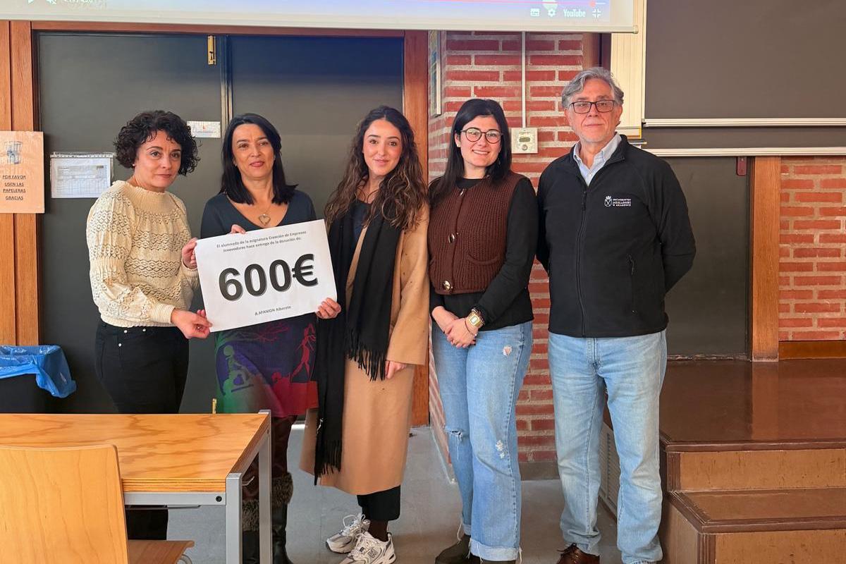 Una veintena de estudiantes de la asignatura “Creación de Empresas Innovadoras” de la Facultad de Económicas y Empresariales de Albacete han entregado a la Asociación de Familias de Niños con Cáncer de Castilla-La Mancha -AFANION- un cheque por valor de 600 euros, como resultado de realizar una actividad de creación de micronegocio, cuya recaudación se ha hecho entrega a la asociación.