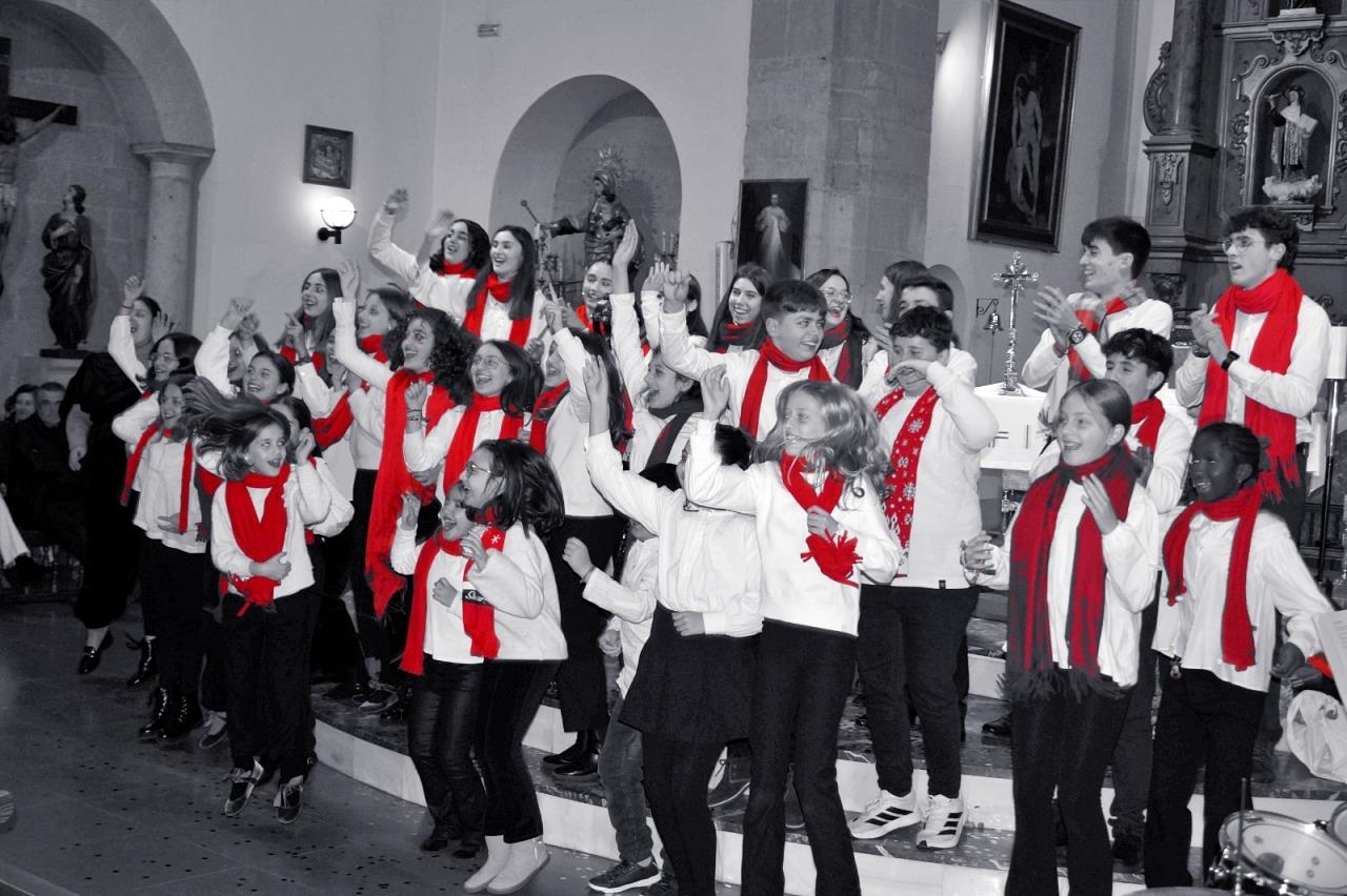 El coro, integrado en esta edición por 35 niños y jóvenes, continúa creciendo año tras año y demostrando su evolución musical. Bajo la dirección de sus responsables, ofrecieron un repertorio pensado para todos los públicos, combinando villancicos clásicos con versiones propias de canciones muy conocidas, adaptadas a la temática navideña.