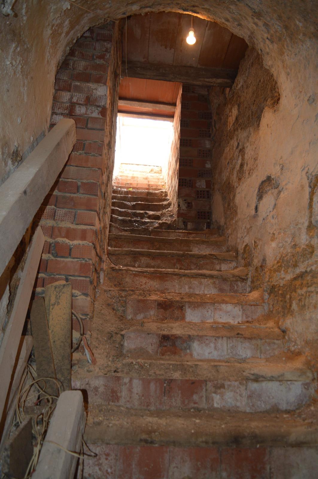 La construcción tiene unos ocho metros de profundidad y, al igual que sucede con la escalera, tiene forma de ele. El techo está en la tosca y vemos cinco lumbreras, dos de ellas condenadas. El propietario nos explica por donde estaba la primitiva escalera que tenía la entrada en el patio de luces de la casa. Por motivos de seguridad, se ha construido un pilar adosado a la pared.
