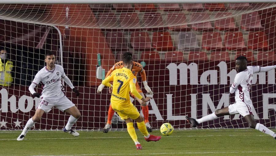 En los últimos minutos del primer tiempo, el Albacete tuvo la mejor ocasión para ponerse por delante en el marcador tras un centro de Carlos Isaac que era rematado por Álvaro Peña y que Dani Barrio rechazaba para evitar el gol manchego. Justo antes del descanso, el equipo blanco tuvo otra gran oportunidad para ponerse por delante en el partido pero de nuevo Dani Barrio salvaba a su equipo tras un centro de Álvaro Peña que rechazaba en Escassi y que el portero del equipo andaluz conseguía atajar.