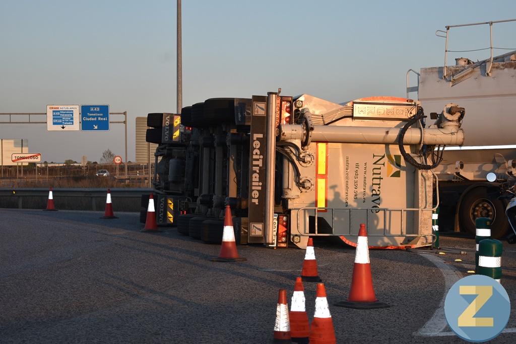 El camión iba cargado con pienso y tras volcar se ha derramado parte de la mercancía que, posteriormente, ha podido ser recuperada con la ayuda de otro camión. En el momento de redactar esta información una góndola ya estaba en el lugar del accidente para levantar el camión. En el lugar de los hechos se han personado agentes de la Policía Local que ha cortado los accesos a la rotonda y también personal de mantenimiento de la A-43.
