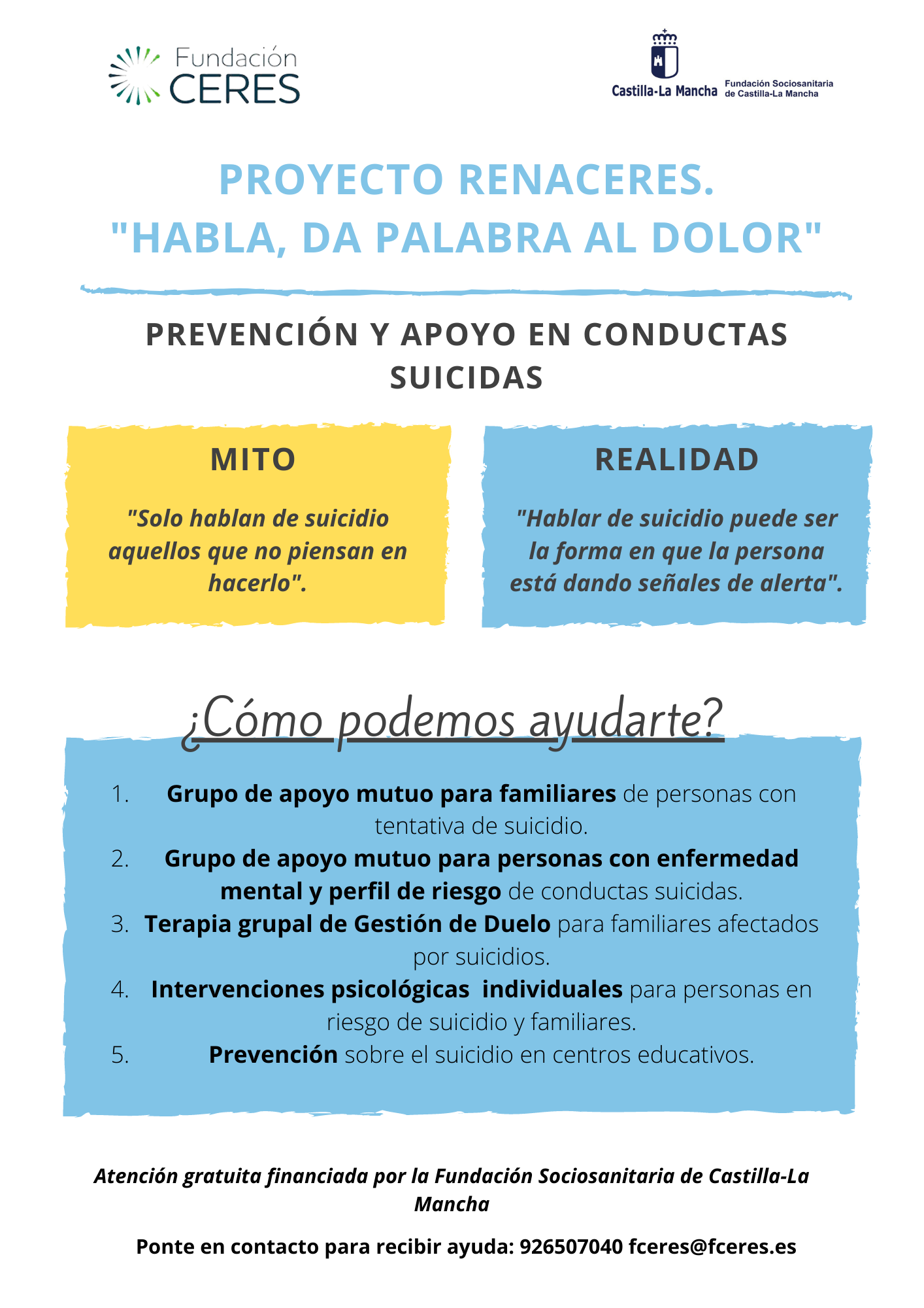 Fundación Ceres pone en marcha por segundo año consecutivo el programa Renaceres  (Prevención y Apoyo en conductas suicidas), dicho programa comienza a realizarse en el año 2020,  un año tan complicado y de tanta exigencia para todas y todos. "Hoy, más que nunca, se hace  necesario un programa para dar apoyo tanto a familiares como a personas en riesgo de suicidio. La  pandemia mundial vivida acrecenta los factores de riesgo asociados al suicidio debido a que lo  vivido afecta la salud mental de muchas personas aumentando la angustia, la ansiedad y la  depresión, concretamente en España, el suicido es la principal causa externa de mortalidad".