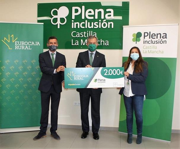 Al acto de entrega de esta aportación asistieron el presidente de la Fundación Eurocaja Rural, Javier López Martín, el director gerente de Plena inclusión CLM, Daniel Collado, y la directora económica de Plena inclusión CLM, Esther Sánchez Escobar.