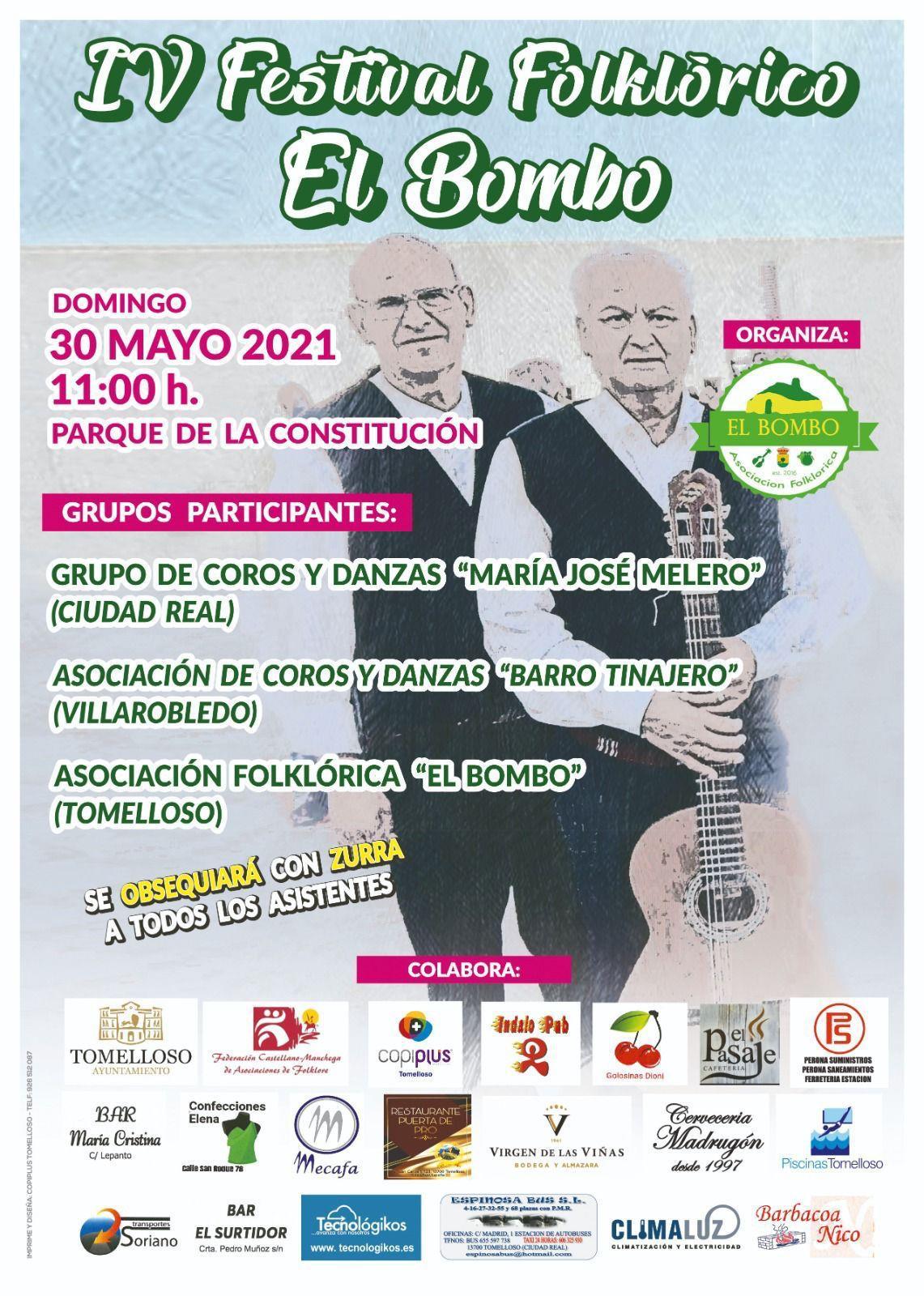 El próximo domingo 30 de mayo tendrá lugar en el parque de la Constitución el IV Festival Folklórico El Bombo que organiza el grupo tomellosero que lleva el mismo nombre. El espectáculo se iniciará a las once de la mañana y contará con las actuaciones de los grupos  "Maria José Melero" de Ciudad Real; "Barro Tinajero" de Villarrobledo y el grupo anfitrión de El Bombo. Todos los asistentes serán obsequiados con zurra.