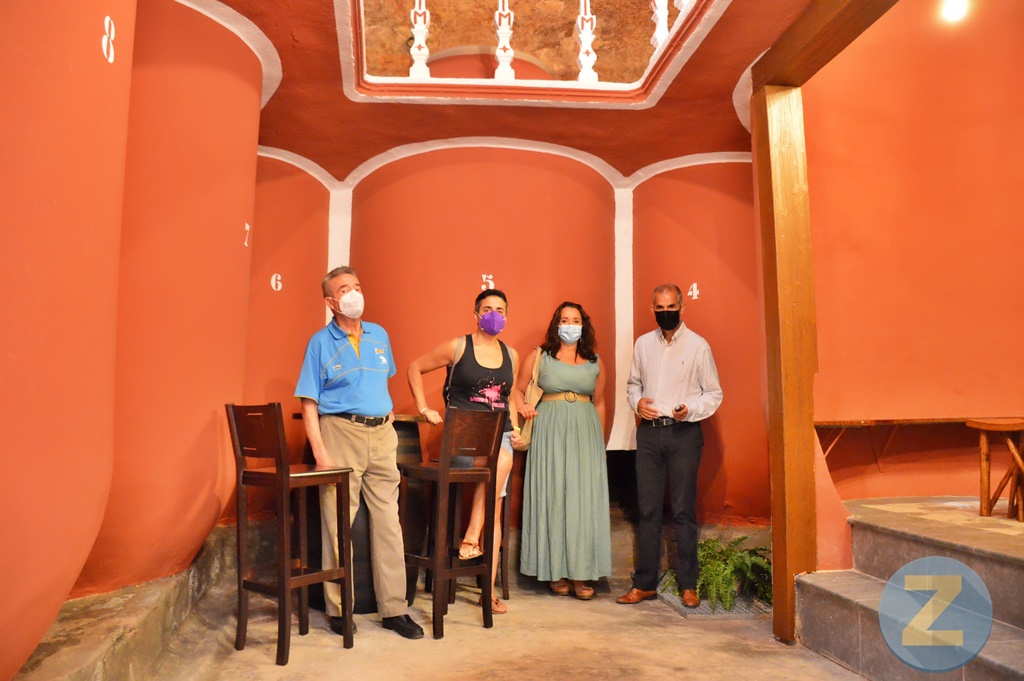 Ya en la cueva nos impresionan las diez tinajas de cemento, de unas cuatrocientas arrobas de capacidad, pulcramente pintadas en un tono granate combinado con el blanco. Dos de esas tinajas se han abierto intencionadamente para crear una zona estancial que debe ser un paraíso para los amantes de la lectura o la buena conversación. En los extremos se ha revestido con un material que imita a la madera y justo en medio hay un pilar de refuerzo en el trayecto de un antiguo pozo de agua. El pilar se utiliza también como botellero. Otra ingeniosa solución.