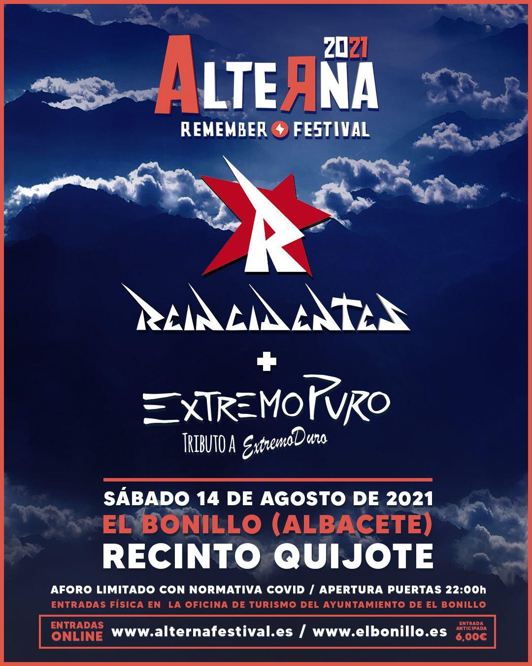Alterna Remember Festival 2021 es una edición especial en formato reducido que pretende rendir homenaje a la edición que se celebró hace exactamente 10 años con una programación muy similar a la de entonces. Reincidentes + ExtremoPuro (Tributo a Extremoduro) serán los encargados de rendir homenaje al festival el próximo sábado 14 de agosto en la localidad de El Bonillo. Un concierto para el recuerdo que estará adaptado a la situación actual de la pandemia y que contará con todas las medidas de seguridad que exige la normativa sanitaria vigente.