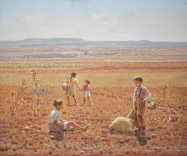 Hacían corrillos en la era, escondiéndose entre la parva recién cortada, imaginando batallas de piratas por las pedrizas, viendo como a los lejos los campesinos dibujaban el surco derecho en la tierra. Niños que esperaban que pasaran cosas diferentes que alteraran el tedio de los días, que levantaban piedras para ver la diminuta fauna de la tierra, que saboreaban el agua fresca del aljibe o la sandía recién cortada. Los pintó López Torres en la calima del verano, en el desapacible otoño y crudo invierno, en la hermosa primavera. Los pintó con una ternura infinita como demostrando la inocencia y entereza con que la niñez se amolda al tiempo que le toca vivir. Y a los niños de López Torres les volvía a cantar Eladio: