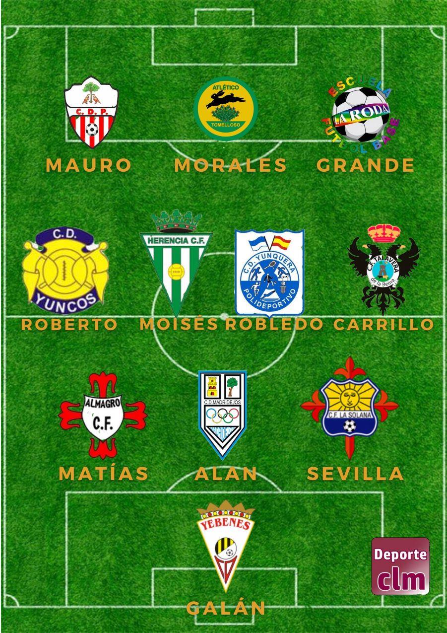 El once la jornada está compuesto por Galán (Yébenes), Matías (Almagro), Alan (Madridejos), Sevilla (La Solana), Roberto (Yuncos), Moisés (Herencia), Robledo (Yunquera), Carrillo (Talavera), Mauro (Pedroñeras), Morales (Atlético Tomelloso) y Grande (La Roda).