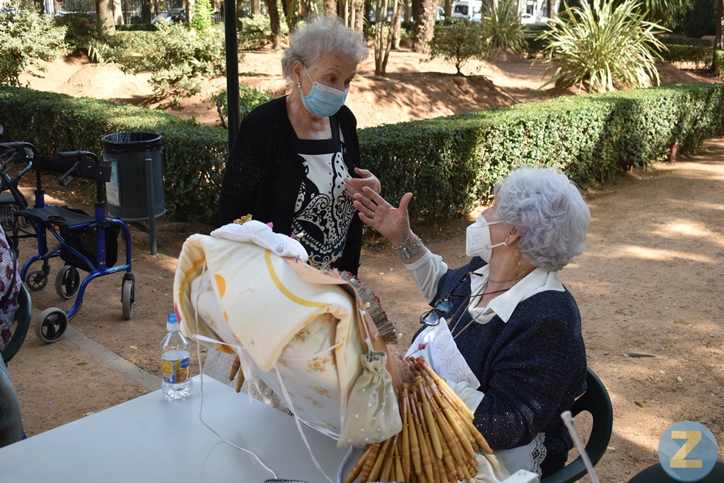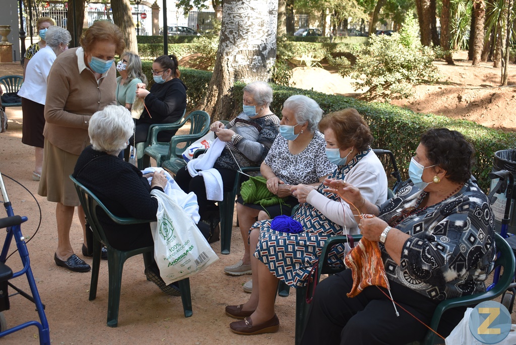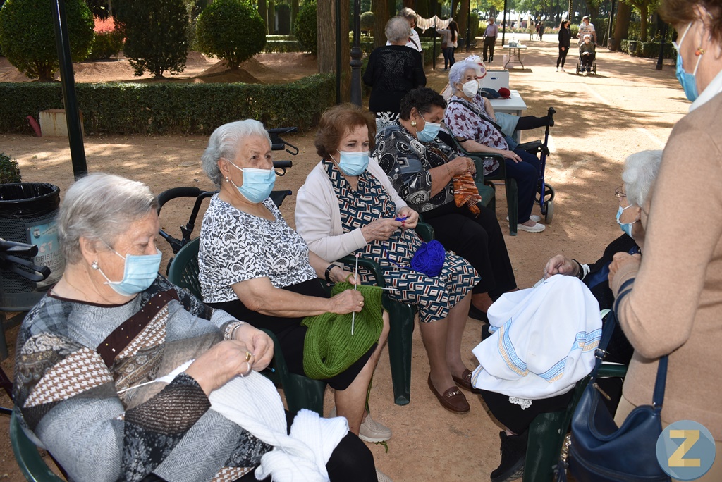 Justo al lado las mujeres se afanan con las agujas tejiendo prendas de abrigo y en el mostrador ya había un buen número. Algunas de ellas han traído los trabajos confeccionados en casa y otras realizan su labor en el parque. Mientras tanto, gente de todas las edades baila en la plazoleta del parque al ritmo que van marcando las monitoras. Para que no falte de nada, el día incluye el sorteo de una cesta.