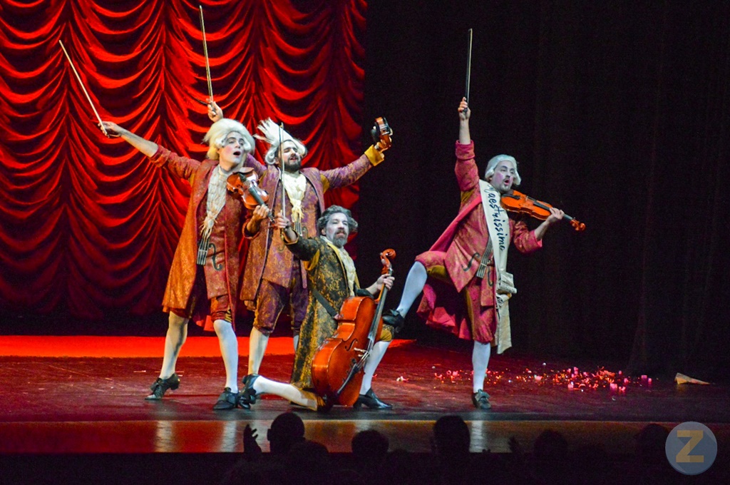 La locura (y el virtuosismo de los cuatro intérpretes) se desata con la primera nota de Las Cuatro Estaciones de Vivaldi. Sin darnos tregua, nos llevan por la música de Bach, Sarasate, Paganini, Mozart, los más famosos politonos de los teléfonos, Roxanne de Police o “Bachsterday”, donde mezclan a los Beatles con la música del genio alemán y es uno de los momentos más emotivos de la función. También tiene sitio en “Maestrissimo”, la música de Beethoven, de Albéniz o de Led Zeppelín y, por supuesto, “La lista de Schindler” de John Williams. Estos cuatro virtuosos son capaces de hacernos deshojar nuestras emociones con su maestría. Pero es que, además de interpretar música, el cuarteto actúa, se mueve, salta, gesticula, baila, interactúa con el público, actúa, en definitiva, y lo hace muy bien.