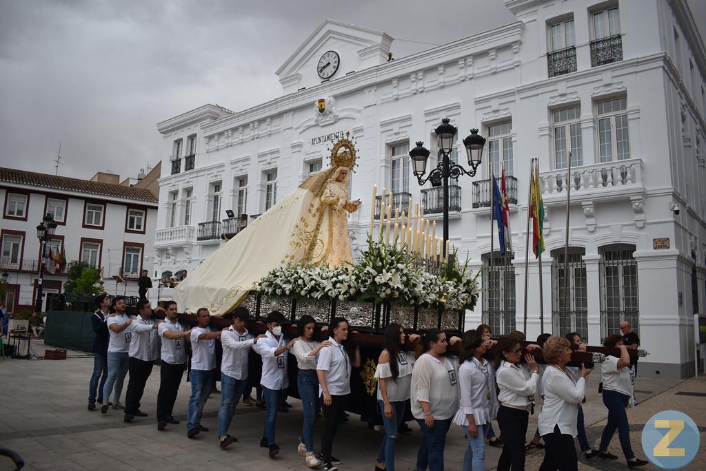 La imagen de la Virgen ha salido en andas de la Iglesia de La Asunción para ser colocada junto al escenario instalado a las puertas del Ayuntamiento. Allí se han colocado los componentes de la coral Lux Aeterna que dirige Antonio Rodrigo y que ha cantado de manera brillante los temas "Señor ten piedad", el Aleluya de Leonard Cohen, el Ave María de Caccini, "Hoy he vuelto" y "Salve Regina".