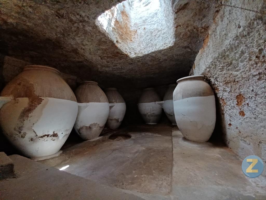 Los peldaños de la escalera están pintados en gris y las paredes están encaladas. Cuando llegamos abajo no podemos dejar de admirar una cueva de pequeñas dimensiones, muy bien conservada. Antonio nos señala el lugar donde se ubicaba el jaraíz y desde allí partía la canaleta que trasladaba el mosto y que daba la vuelta a toda la cueva. “Cuando el mosto iba llegando lo conducían a las tinajas con una tabla”. El propio tamaño de las tinajas y la altura de la cueva son otros signos evidentes de la antigüedad de la construcción, como muy bien apunta José María Díaz, el experto tinajero que vuelve a acompañarnos, al igual que la arquitecta, Ana Palacios, que dispara con su cámara a todos los rincones de la cueva.