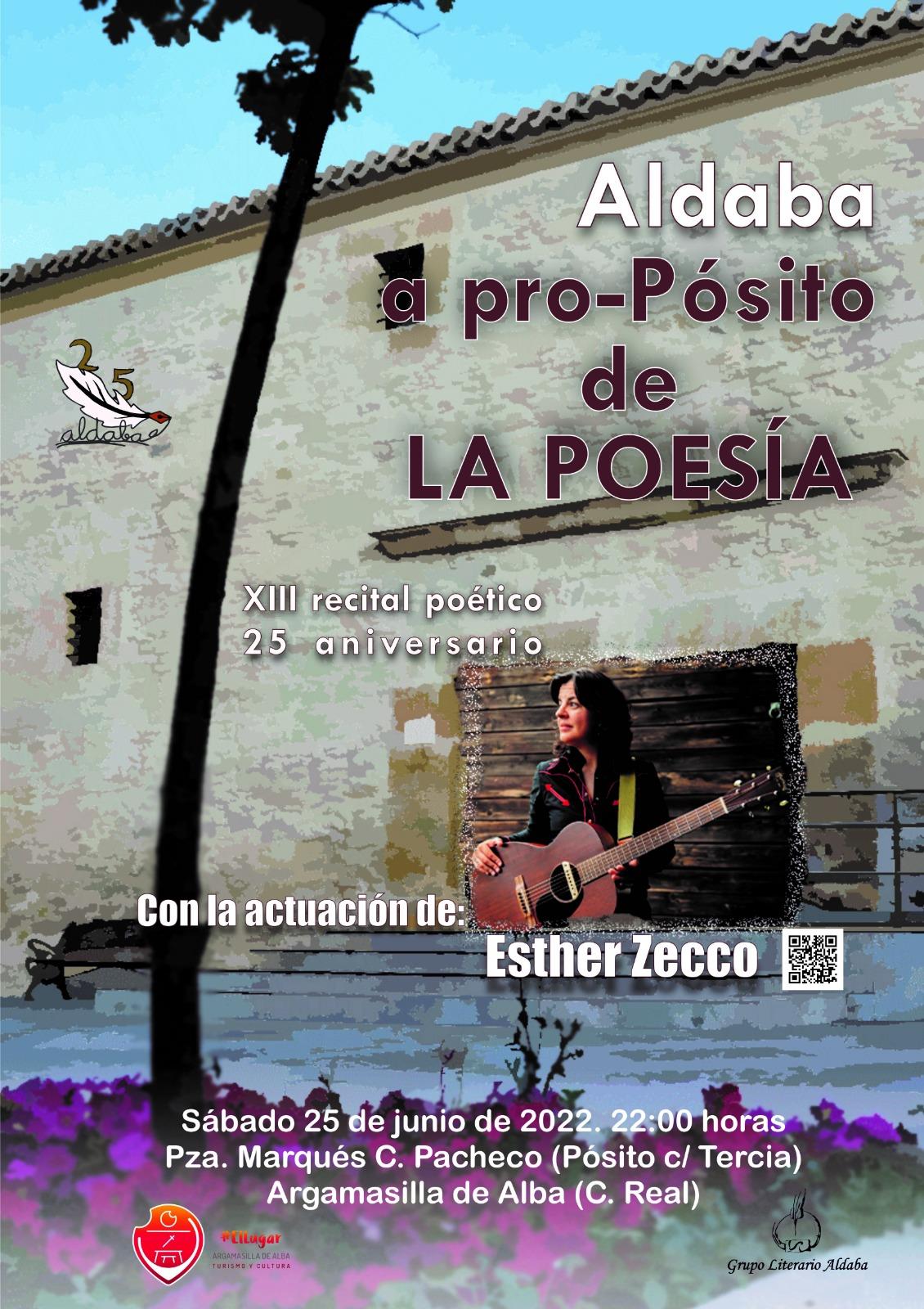 Como en cada edición los miembros de Aldaba recitarán poemas dedicados a un poeta consagrado al que se rendirá homenaje y como cierre del acto contaremos con la cantautora segoviana Esther Zecco. El recital de "Poesía a Pro-Pósito" nació de la necesidad de sacar la poesía a la calle y compartirla con todos aquellos que quieran pasar una noche llena de poesía y música sentados "al fresco". Desde que en 2008 se celebrara su primera edición y debido a la buena aceptación por parte de público e instituciones, el Grupo Literario Aldaba cuenta ya con su décimo tercera edición, que este año coincide con el 25º aniversario del grupo.