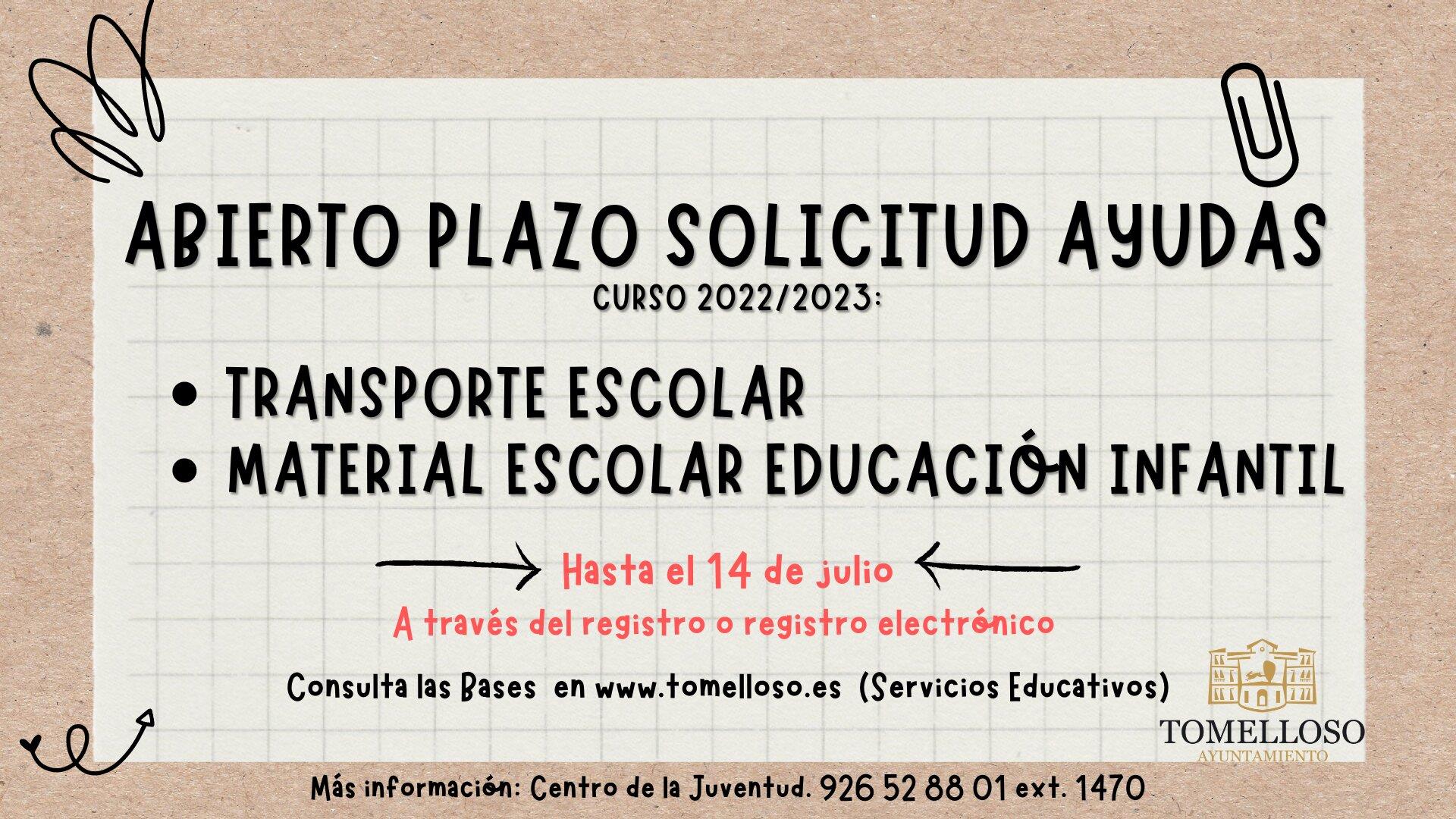 Hasta el 14 de julio estará abierto el plazo para solicitar las ayudas para material y transporte escolar convocadas por el Ayuntamiento de Tomelloso para el curso 2022-2023. Las bases completas de las convocatorias se pueden consultar en los servicios educativos de la web municipal o en la concejalía de Educuación en calle Soria esquina La Paz.