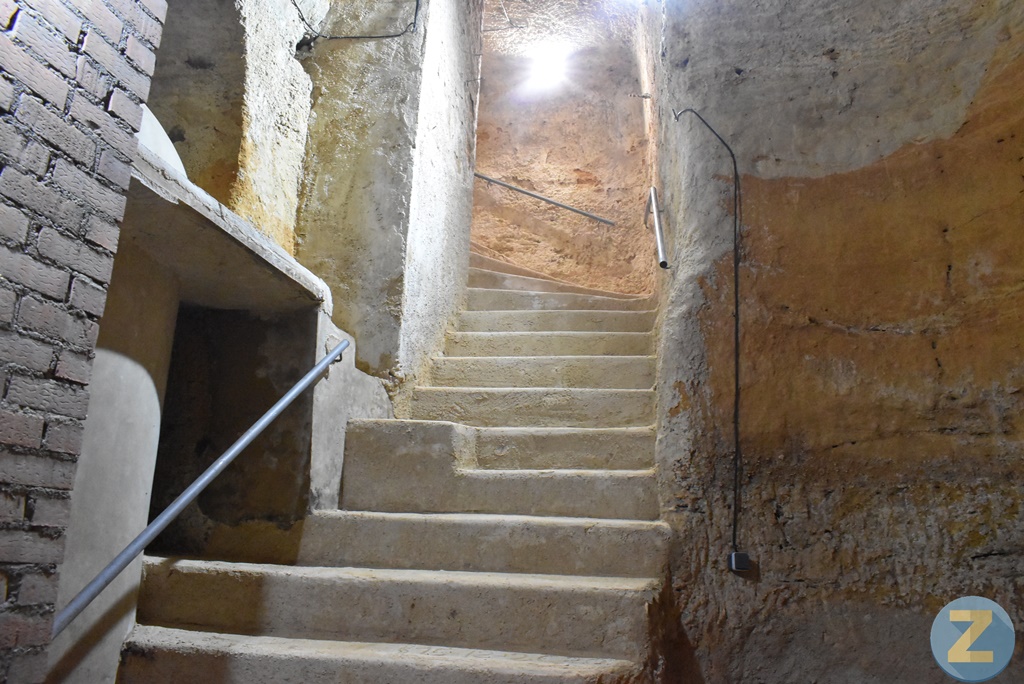 Las paredes y peldaños de la escalera están revestidos de cemento. No tardamos encontrar curiosos detalles como una bombona cubierta de esparto, colocada en una especie de alacena. Unos cuantos peldaños abajo encontraremos una pequeña tinaja, justo cuando la escalera tuerce a la derecha, formando una preciosa esquina a modo de abanico, en el punto donde empieza a ganar en anchura. Un pasamanos de forja es señal inequívoca de que los propietarios cuidan los detalles y enseñan a la gente esta cueva, que según apunta, José María Díaz, fue construida antes del 1900.